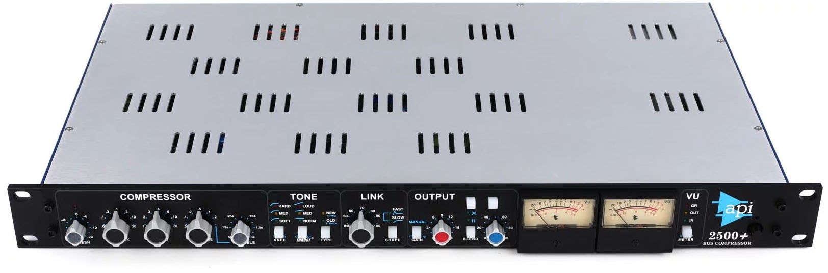 The API 2500+ Stereo Bus Compressor joins the company’s regular lineup, bringing all that formidable dynamics-shaping power to your rack in a sleek, space-saving 1U chassis. The API 2500+ model added a sophisticated Mix/Blend circuit to API’s venerable design coming form the anniversary edition. API’s flagship compressor delivers the inimitable sound of iconic API compression along with unparalleled parametric control. The result is an incredible-sounding, versatile, world-class stereo bus compressor capable of handling any audio production task. Meticulously designed to deliver a broad range of compression options and features not found on most compressors, the API 2500+ delivers warmth, clarity, and punch, whether used for nuanced dynamics control, brick-wall limiting, or anything in between.