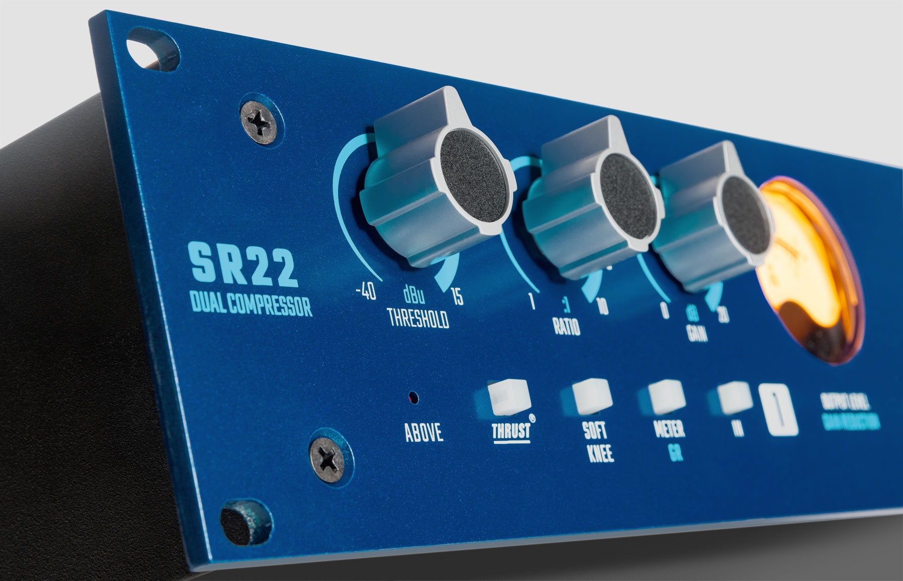 The perfect companion to the new SR24 Dual Channel EQ, the SR22 provides comprehensive, easy-to-use control along with classic analog VU meters for monitoring output and gain reduction. The two channels can also be linked for use as a stereo compressor with true RMS power summing of the left and right signals.