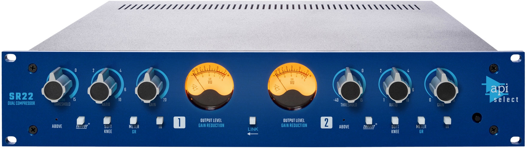 The SR22 Dual Channel Compressor features two channels of API's patented award-winning compressor circuit in a rackmount unit with internal power supply. This same compressor circuit was originally designed into the legendary ATI Paragon analog live mixing console. Each channel includes the patented THRUST® circuit, which protects the sensitive high frequency content of the audio signal, even under the most vigorous of compression ratios.