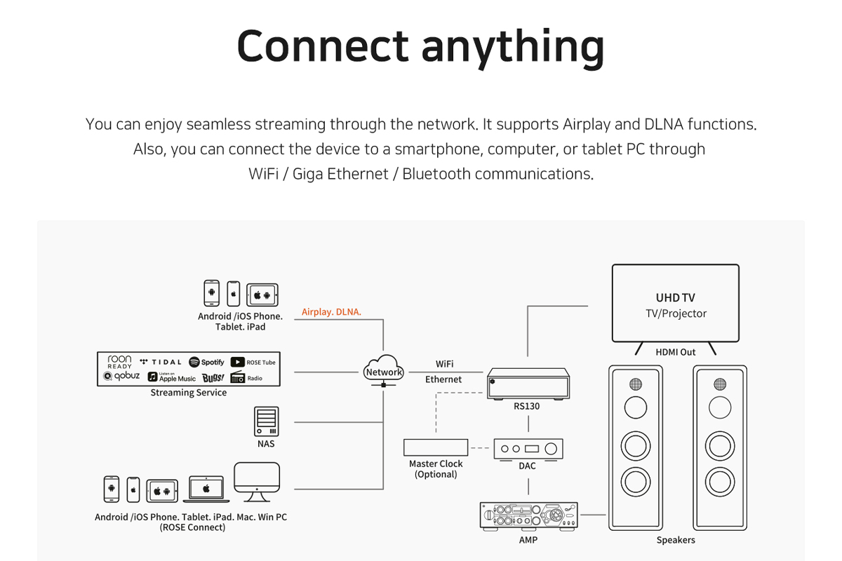 Για όσους εξακολουθούν να χρησιμοποιούν κλασσικά ethernet και USB, η HiFi Rose θα σας καλύπτει επίσης. Αυτό είναι ένα από τα καλύτερα χαρακτηριστικά του RS130. Η εταιρεία αφιέρωσε χρόνο για να σκεφτεί οποιαδήποτε δυνατή κατάσταση όπου αυτό το προϊόν θα μπορούσε να χρησιμοποιηθεί. Από τις οπτικές και κλασσικές δικτυακές συνδέσεις και εισόδους USB, Wi-Fi και Bluetooth, USB 3.0, USB DAC, I2S με πολλαπλές διαμορφώσεις pin, οπτικό, ομοαξονικό, AES/EBU και θύρα HDMI 2.0 ειδικά για έξοδο βίντεο 4K.