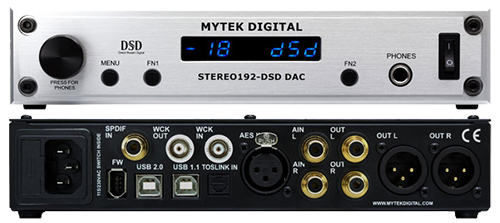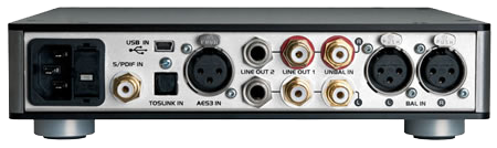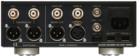Αυτή είναι η πίσω όψη ενός πιο προηγμένου DAC, συγκεκριμένα του Weiss DAC202. Εκτός των εισόδων που αναφέρθηκαν παραπάνω, η συσκευή αυτή φέρει και φηφιακές εξόδους, ώστε να συνδέσετε κάποιον ανάλογο εγγραφέα. Αντί της USB, αυτός ο DAC φέρει δύο θύρες firewire, ώστε να συνδεθεί σε ανάλογη θύρα του υπολογιστή. Τέλος, φέρει και υποδοχή sync-in, μέσω της οποίας μπορεί να χρονισθεί από εξωτερικό ρολόι, ενώ το σήμα αυτού του ρολογιού το δίνει μέσω της εξόδου sync-out και σε άλλη ψηφιακή συσκευή που ενδεχομένως θέλετε να συνδέσετε επάνω στο εξωτερικό ρολόι.