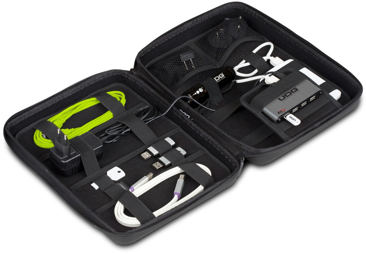 Σκληρή θήκη, ειδικά σχεδιασμένη για την αποθήκευση 2x εξωτ. Σκληρών Δίσκων, USB stick, καρτών SD, καλωδίων, τροφοδοτικών, φακού κ.α. Η UDG Creator DIGI Hard Case Large περιλαμβάνει 1x Ultra Slim Aluminium 7-Port USB 2.0 Hub και 1 τροφοδοτικό 5V/2A .
