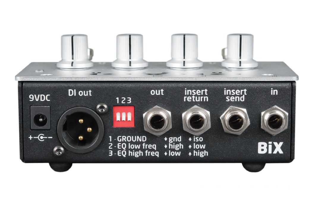 Controls are dead simple – input gain, high and low shelving EQ, and a 10dB variable boost circuit, with footswitches for mute and boost. I/O includes the instrument input, separate send and return insert jacks, an unbalanced line output, and a balanced ISO DI output on XLR. For enhanced EQ control, rear panel DIP switches select between two different transition frequencies for both High and Low controls. And BiX is pedalboard friendly, with a 9VDC power input and a compact, rugged low-profile chassis.