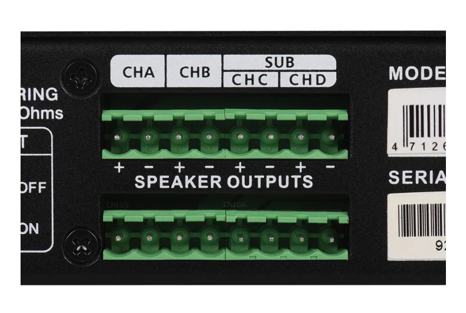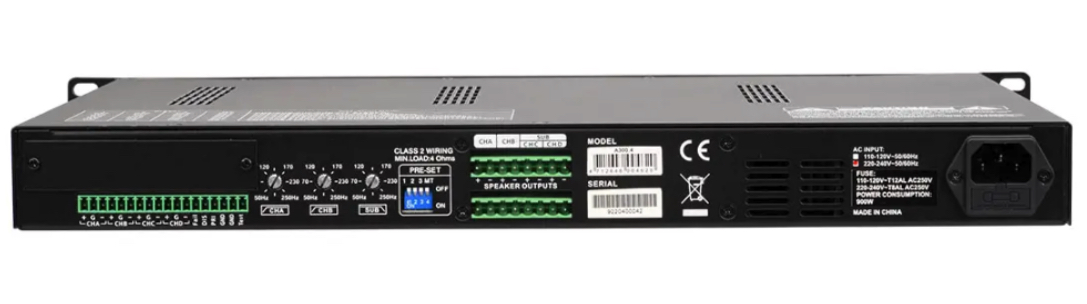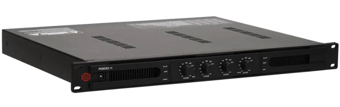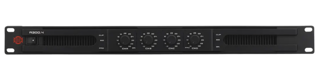 Show A300.4 επαγγελματικός Class D τελικός ενισχυτής 4 καναλιών με ισχύ 4 x 270W στα  ή 4 x 450W στα 2Ω,  διαθέτει cross-over και έχει τη δυνατότητα bridge και απόδοση 2 x 900W στα . Ελαφριά και συμπαγή κατασκευή, απεικόνιση με LED και ανεξάρτητος έλεγχος έντασης κάθε καναλιού. Ιδανικός για μόνιμες εγκαταστάσεις και πολυζωνικές εφαρμογές. Μέγεθος Rack 1U. Διαστάσεις (MxBxY) 483 x 360 x 44mm – 6,2 κιλά.