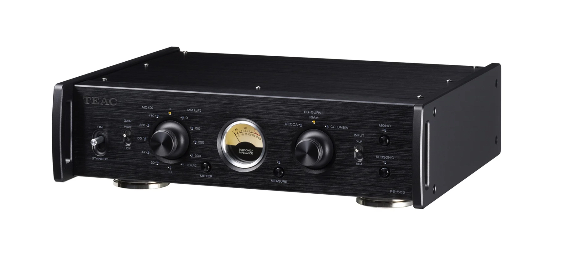 The PE-505 equips switchable load-capacity for MM cartridges and switchable load-resistance for MC cartridges. Furthermore, the load-resistance measuring function allows users to select an appropriate load-resistance by pressing the MEASURE key on the front panel to show the total load-resistance value including cable resistance on the gauge.