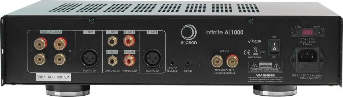 The Elipson Infinite A1000 power amplifier is a class D model using a DSP capable of handling large amounts of data simultaneously. The Elipson Infinite A1000 amplifier has been designed to power one or more Elipson Infinite S12 built-in subwoofers .
