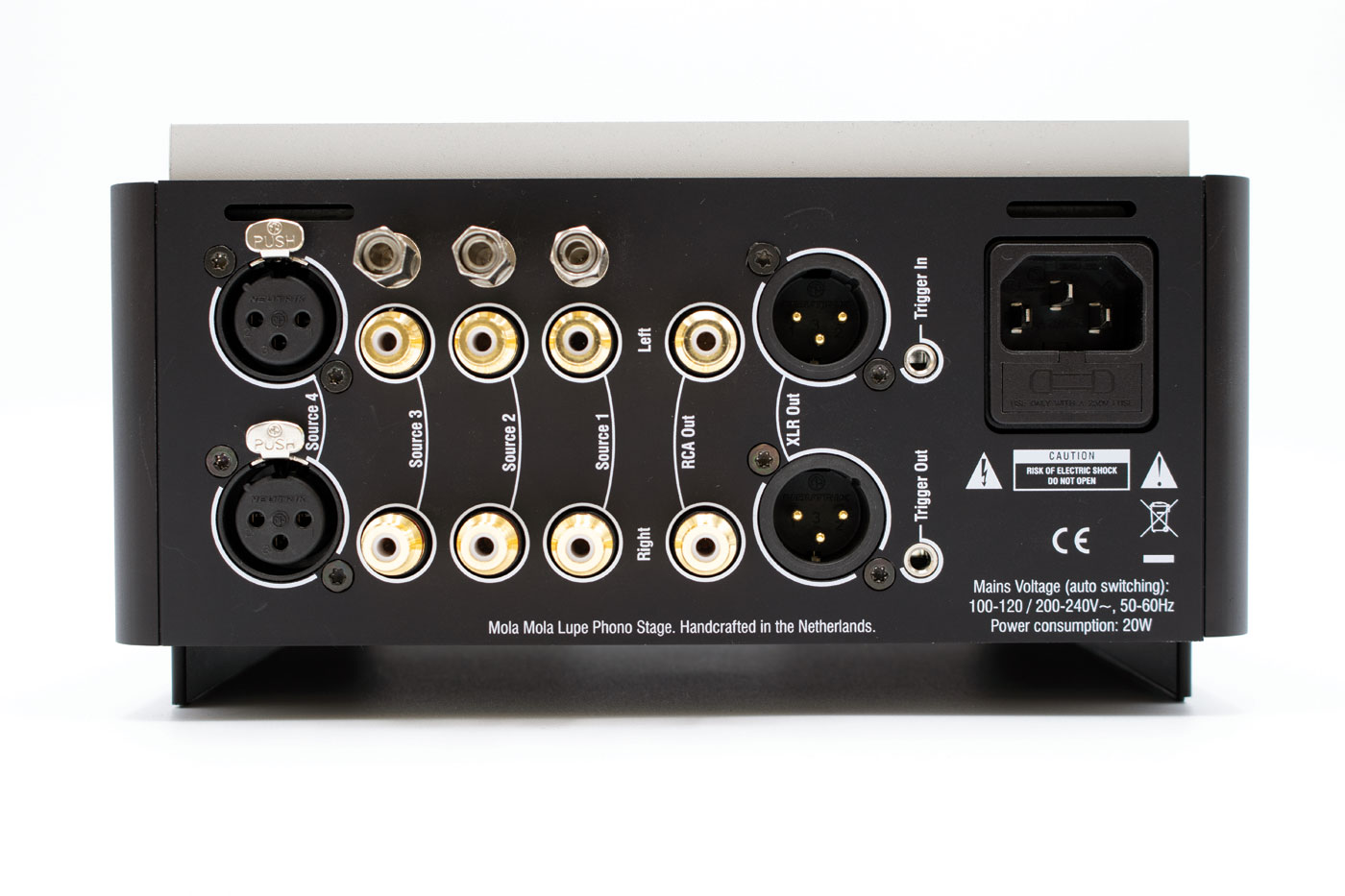 All settings are software controllable, either on the fly using a smart-phone or tablet via the Mola Mola Remote app or directly stored under the preset buttons. Digitally controlled all switching is done in the analogue domain. The Lupe can be configured to route any of the four inputs through the phono stage, this allows you to have multiple turntables and/or cartridges connected.
