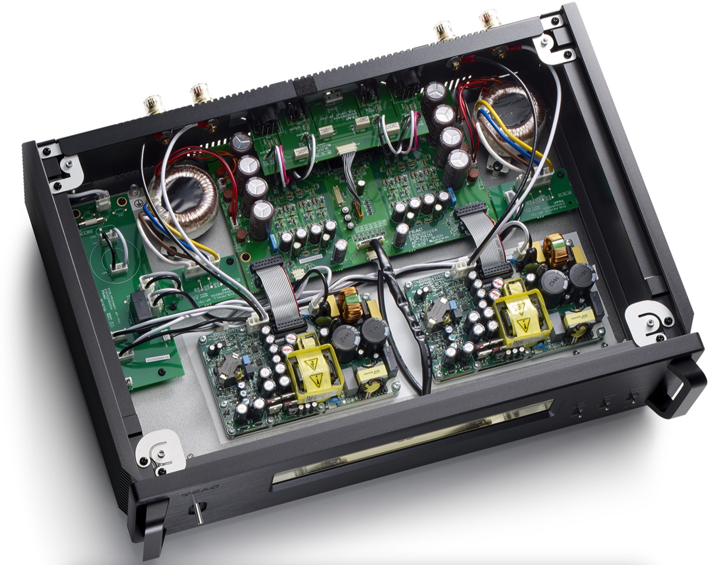 In order to suppress vibrations that affect audio quality thoroughly, the TEAC original pin-point feet that utilize a new mechanism are attached to the bottom panel with appropriate allowance, while a number of screws that fix the circuit boards to the chassis are minimized.