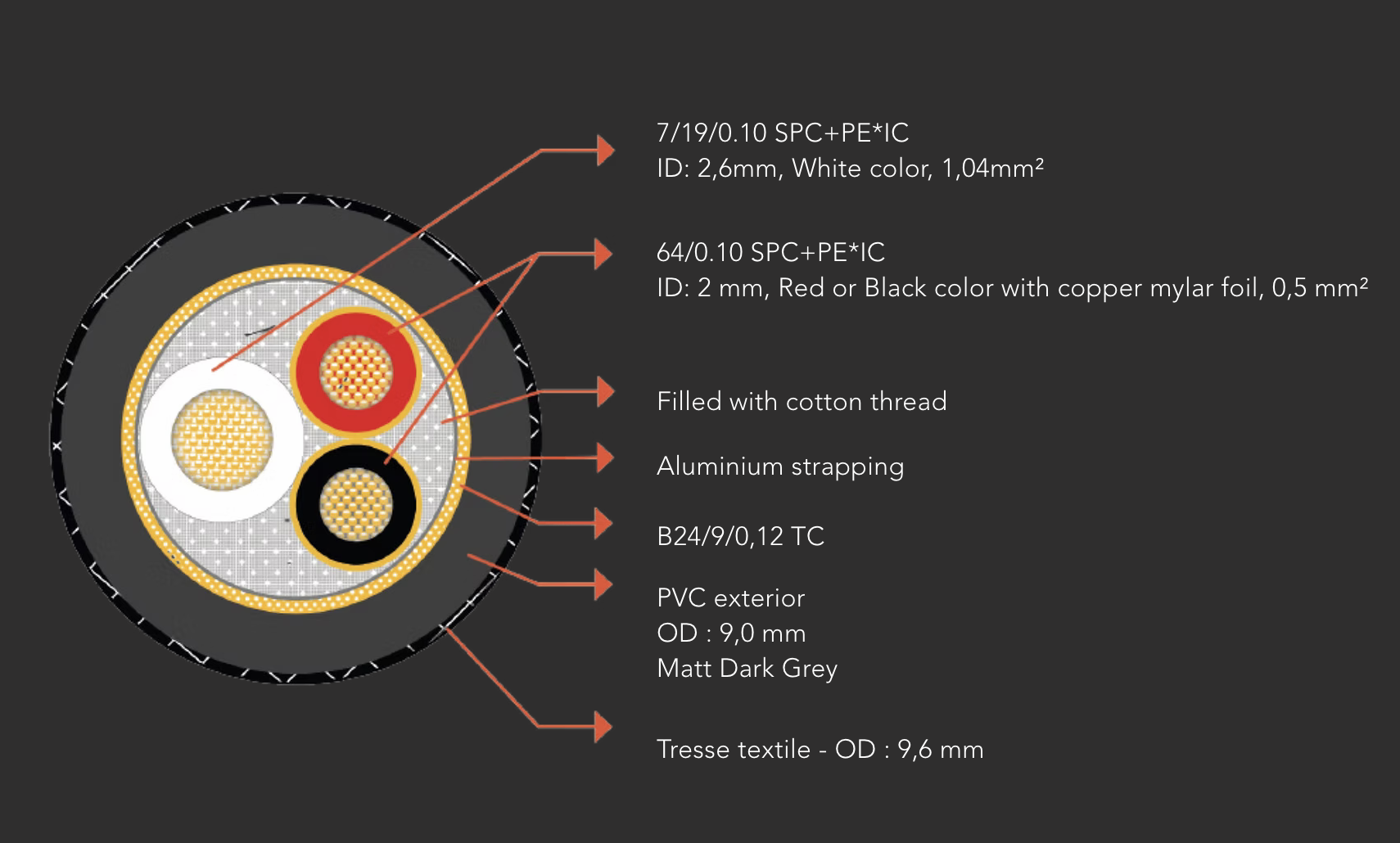 Triple shielding for perfect isolation from surrounding electromagnetic and radio frequency interference (RFI & EMI): hot and cold conductors shielded by copper-mylar sheets, a central core filled with cotton fibers to minimize internal micro-vibrations, and a thick external shielding of aluminum and PVC foil for optimal peripheral isolation.