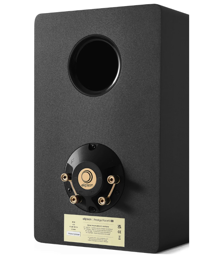 Like all speakers in the range, the Elipson Prestige Facet II 8B bookshelf features a high-end dual terminal block compatible with bi-wiring and bi-amping. The contacts are silver-plated to maximize signal transmission and support banana plugs, spades, and heavy-gauge cables.