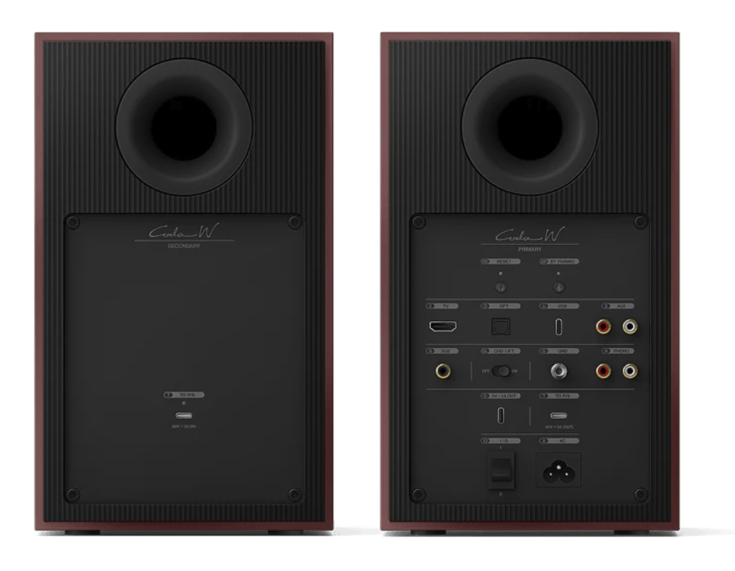 - amplifier built into primary speaker delivers 100 watts to each speaker (70W to woofer, 30W to tweeter)