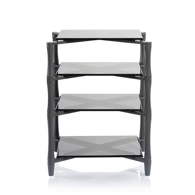 Each of the grey smoked glass shelves is supported by an absorbent PVC strip specifically developed for this piece of furniture. While keeping a fine and elegant design, the Slender offers perfect stability thanks to its structure made of very thick tapering metal tubes.