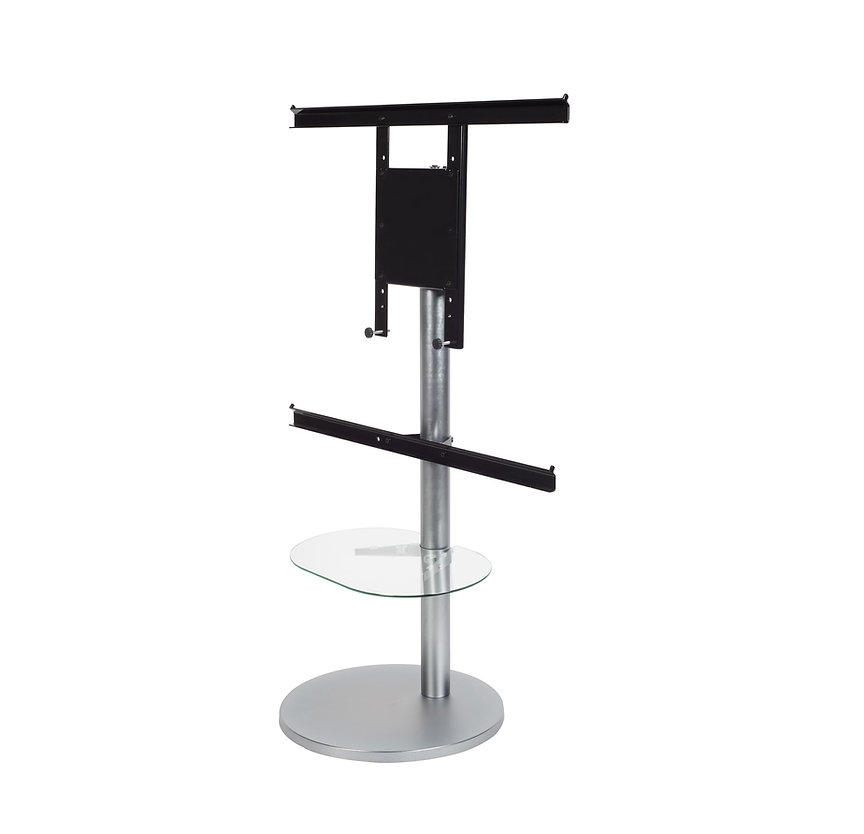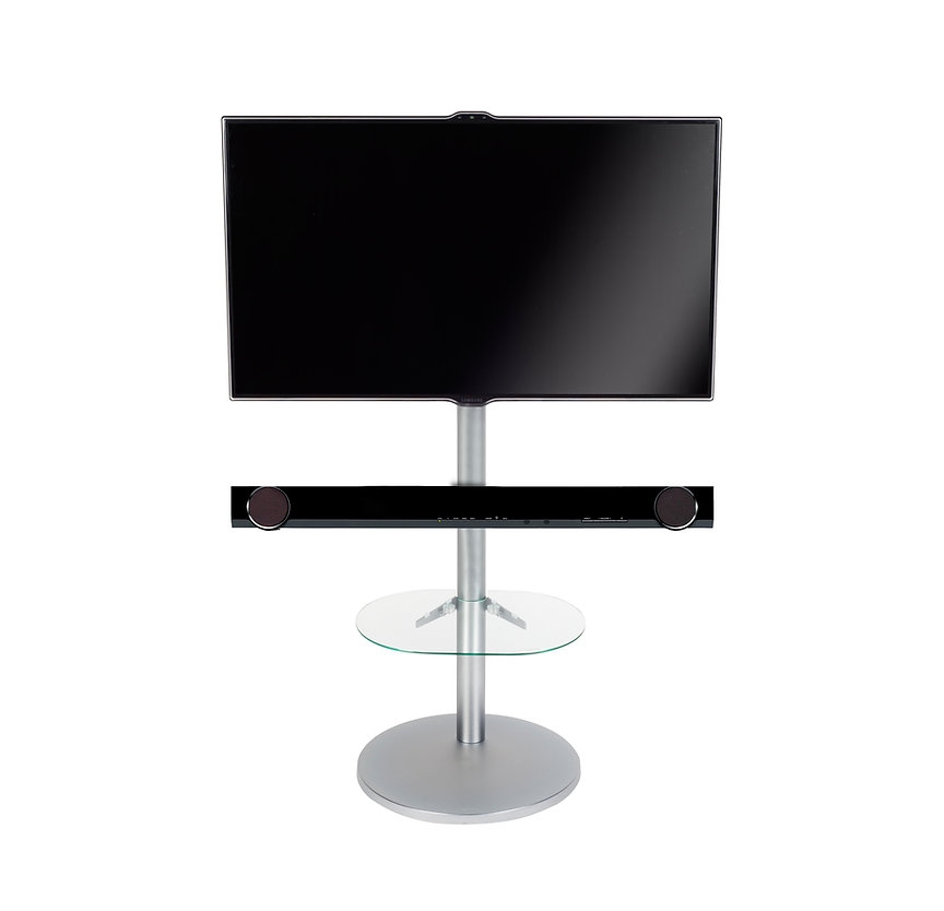 TV support and sound bar. Its design, its fine structure and its functional side allow you all placements, all fantasies, all solutions; against a wall, in a corner, in an up or down position.... The Tiblen SB TV stand is adjustable in height (+/- 30 cm) and its glass shelf for a DVD player or console, as well as the sound bar stand, are removable.