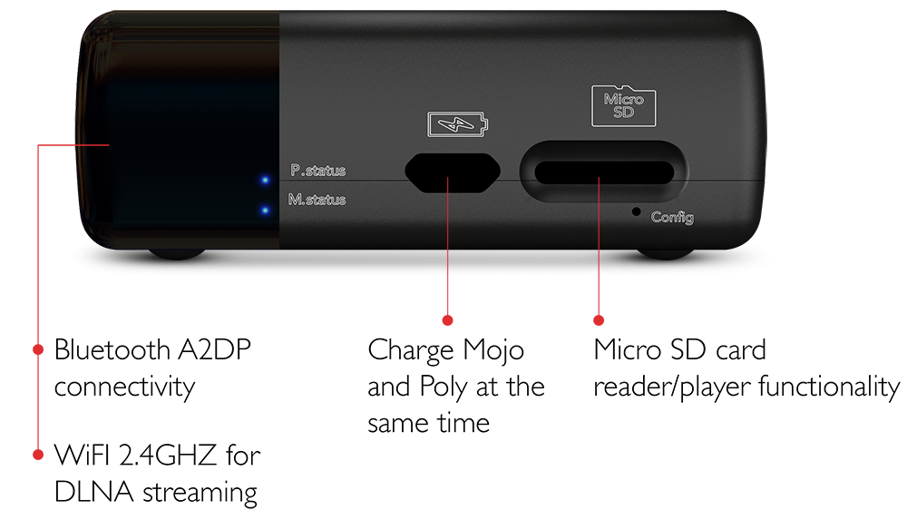 Poly is a portable music streamer/player that combines with Mojo to wirelessly stream from connected devices and playback from its Micro SD, all with smartphone control. It enables hi-fi sound quality at home or on-the-go, with Wi-Fi, Bluetooth, AirPlay and network connectivity and upgrades headphone, car and home audio performance.
