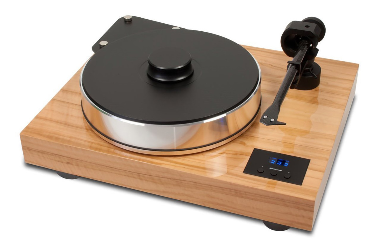 The heavyweight platter spins on an inverted ceramic ball bearing with a magnetic support to reduce bearing noise and resonance to an absolute minimum.