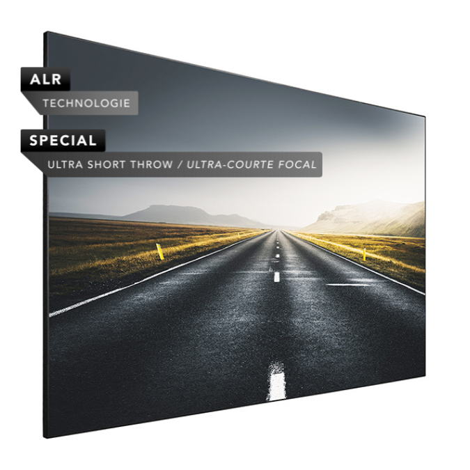 Movie Palace is the best-selling frame video projection screen in France. As an extra bright version, the frame is also only 12 mm thick. WIth extra bightness on the screen and an ultra-slim profile, it discreetly fits perfectly into all interiors and ensures perfect tension thanks to its fastening system. Ambient Light Reflecting fabric offers a microstructured structure. This is a new type of surface that absorbs ambient light from the room while reflecting the light beam of the short-focus projector to the viewer. 100 times brighter than a conventional canvas, this technical surface offers a high level of contrast and the best possible visualisation characteristics in broad daylight.