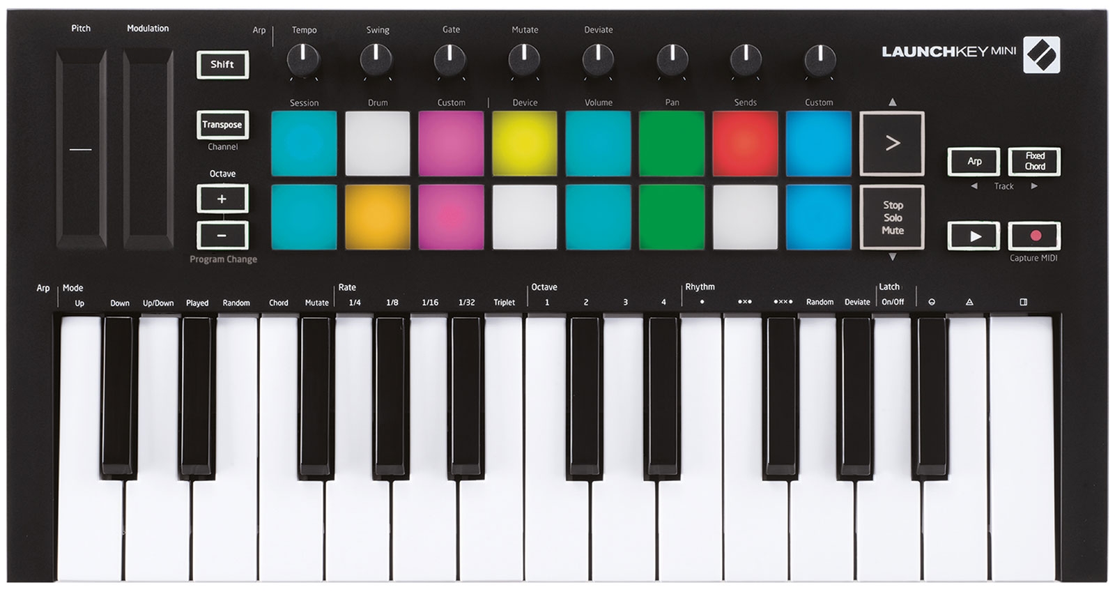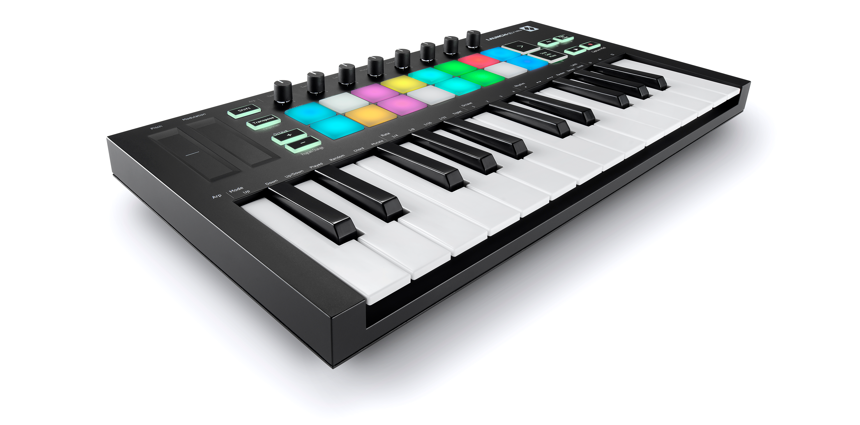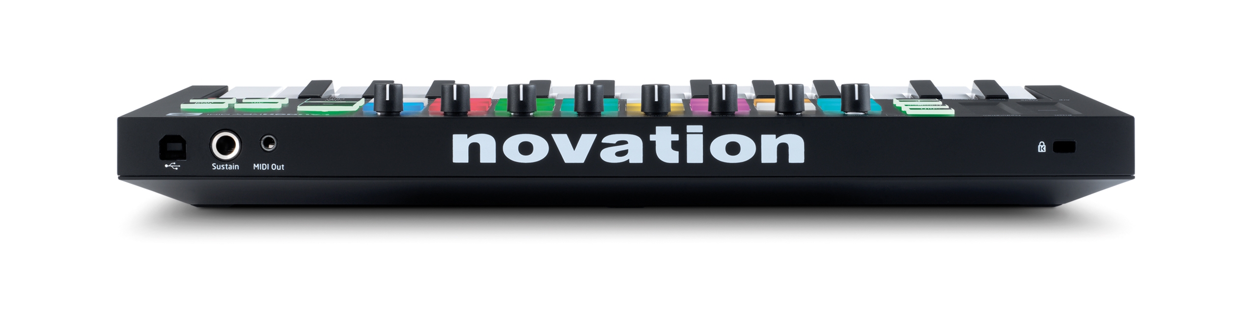 USB midi keyboard με 25 δυναμικά mini πλήκτρα, 16 φωτιζόμενα trigger pads και 8 περιστροφικά knobs. 2 Octave κουμπιά, 2 Track, 2 Navigation, 1 InControl, pitch και Modulation stripes, arpeggiator, midi rec και midi out με εφαρμογή αντάπτορα. Λειτουργεί με τα apps της Νovation για iOS αλλά και με οποιαδήποτε εφαρμογή υποστηρίζει midi. Περιλαμβάνεται το Ableton Live Lite και μια σουίτα με plug-in. Χρώμα μαύρο. Βάρος 700gr.