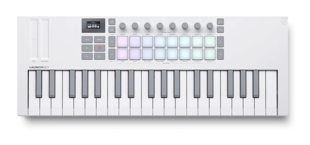 Launchkey has been re-engineered to look, feel, and play like an instrument — from the high-quality keybed and unique patented Launchpad-style FSR pads, to the continuous encoders and crisp, bright OLED display. Launchkey combines these elements with onboard creative tools that allow you to produce chord progressions, bass lines, melodies, and sequences with expression and speed.