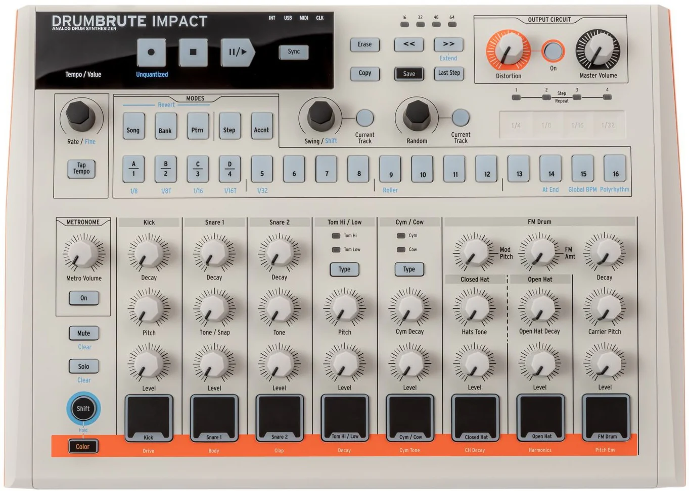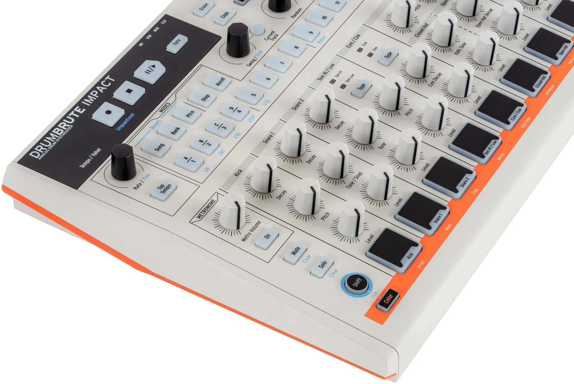Get ready to meet a different kind of Brute. A drum machine with attitude, DrumBrute Impact is an addictively fun, instantly satisfying beat maker with a beefy, unique voice. Featuring amazing performance controls, superb connectivity, and analog sounds that will give your music a powerful, visceral energy.