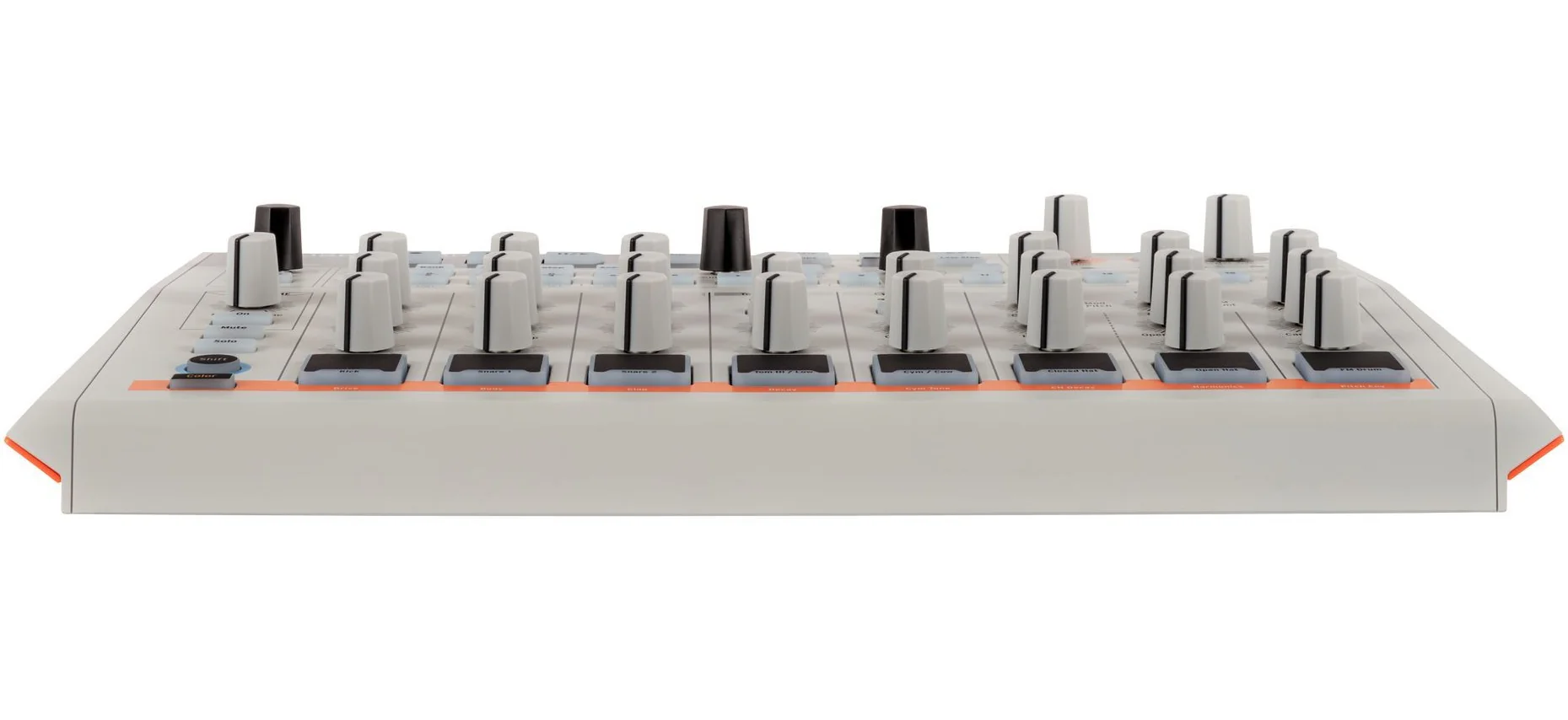 The same powerful 10-voice analog drum machine, reimagined in an iconic off-white finish. DrumBrute Impact 1984 merges in-your-face analog percussion with a polyrhythmic 64-step sequencer and modern-sounding appointments in a compact, instantly satisfying beat-making machine.
