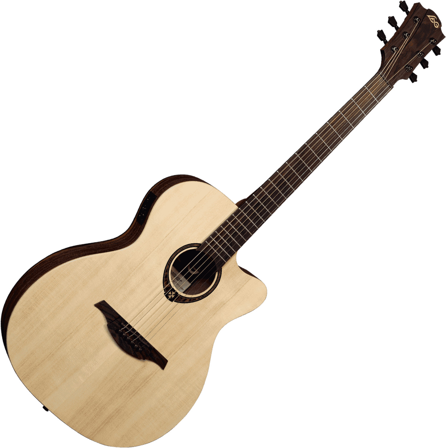 Ηλ/ακουστική κιθάρα Tramontane Auditorium Slim T270 με προενισχυτή Fishman Ink3 preamp με Sonicore pickup, καπάκι από μασίφ έλατο sitka, πλαϊνά και πίσω μέρη από Flamed Snakewood, μπράτσο από Tropical Khaya με φινίρισμα Satin, ταστιέρα από Brownwood, μαύρα μεταλλικά μέρη, χρώματος φυσικού..