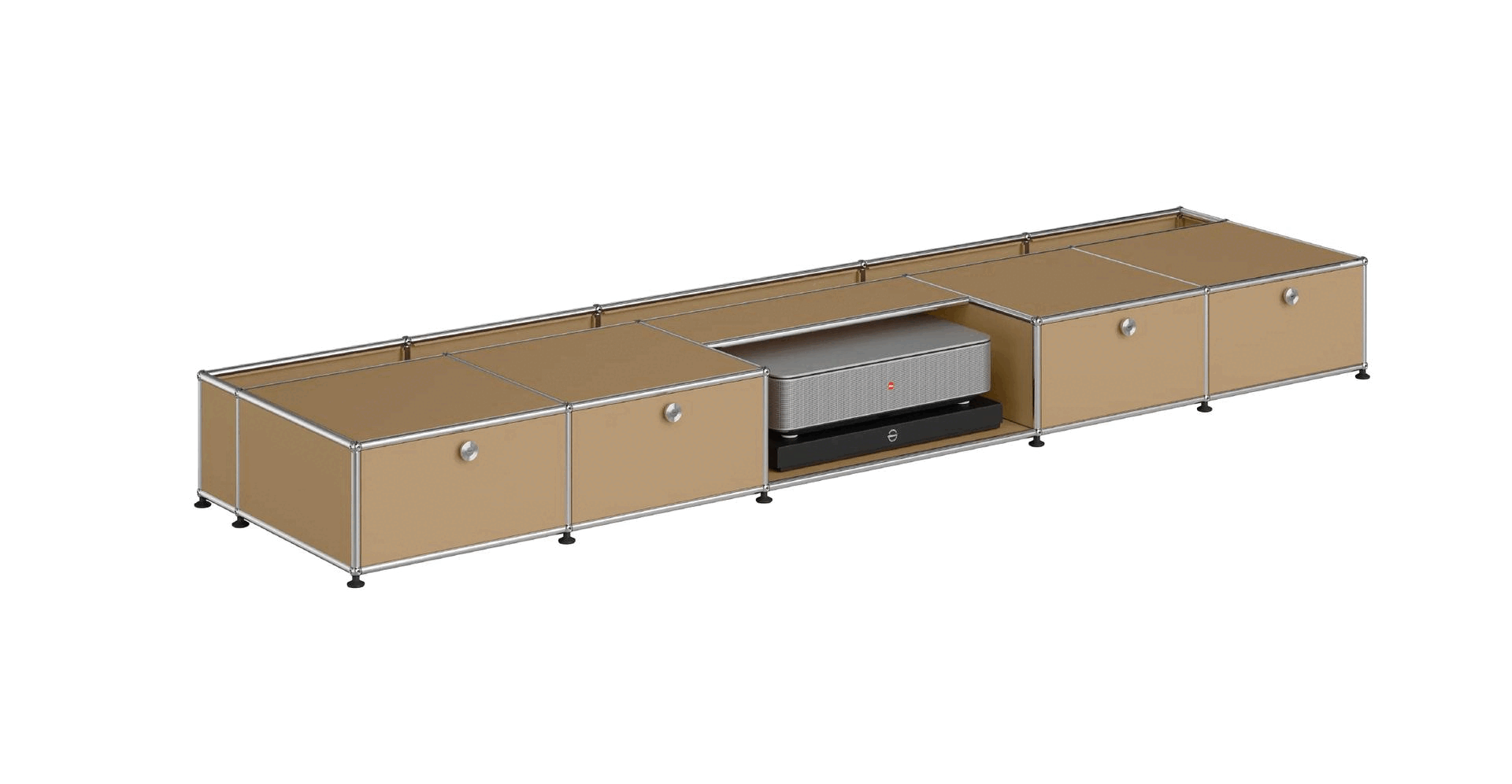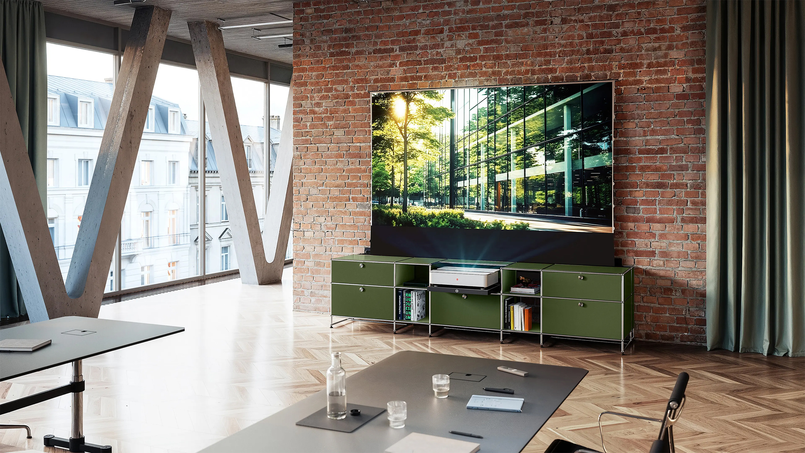 Η δεύτερη λύση επίπλωσης της USM, σε συνεργασία με το Leica Cine 1, μεταμορφώνει το σαλόνι σε εμπειρία home entertainment κορυφαίας κλάσης. Ο κομψός και διαχρονικός αρθρωτός μπουφές συνδυάζει την οργάνωση καλωδίων, τις συνδέσεις και τη μηχανοκίνητη οθόνη με απόλυτη αρμονία. Όταν ο προβολέας είναι σε αναμονή, η οθόνη κρύβεται μέσα στο έπιπλο και απελευθερώνει τον τοίχο, δημιουργώντας μια καθαρή αισθητική. Με δύο εκδόσεις για 100 και 120 ίντσες, η USM και η Leica προσφέρουν λύσεις προσαρμοσμένες σε κάθε εσωτερικό σχεδιασμό.