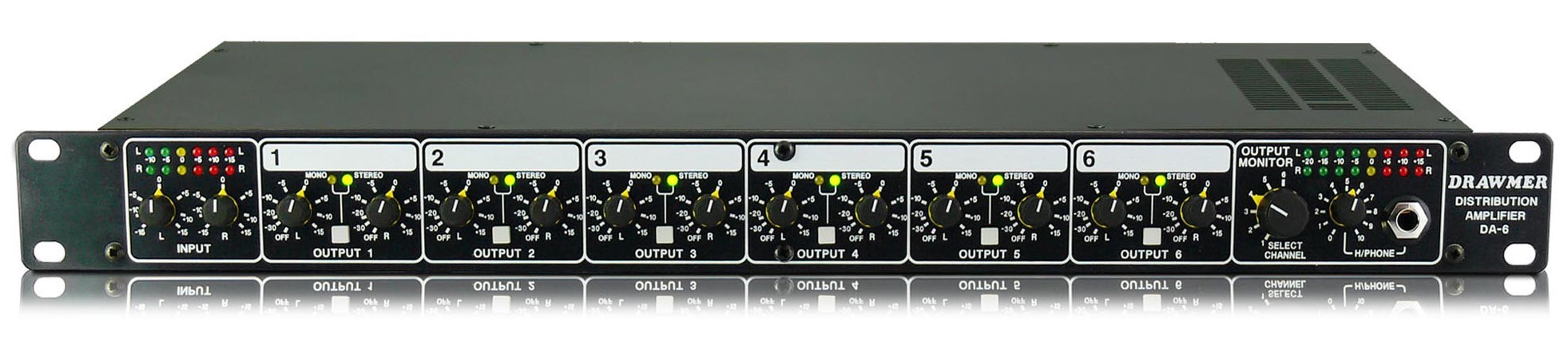 The Drawmer DA-6 is a six channel stereo (or twelve channel mono) distribution amplifier featuring XLR balanced inputs and outputs with optional transformer balancing where remote amplifiers and recorders are fed from separate power supplies.