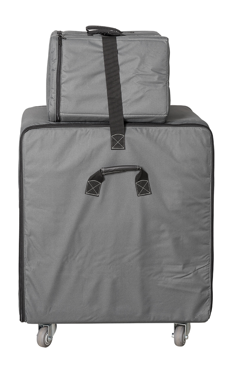 A three-piece, modern protective sleeve set in dark gray. Consists of a subwoofer sleeve with integrated roller board and two satellite sleeves – all three sleeves feature handy circumferential zip openings – for the safe and easy transport and storage of LUCAS 2K.