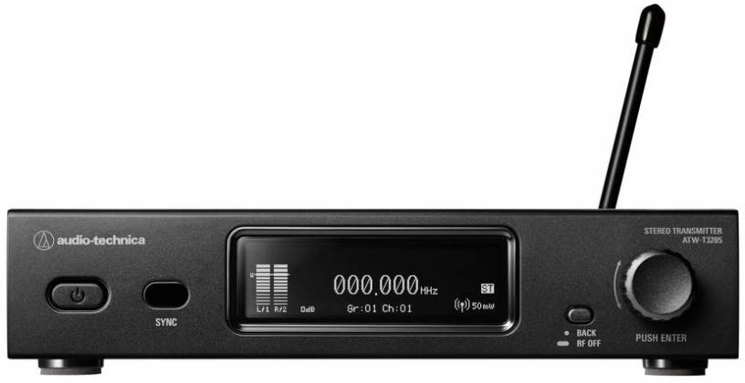 • Rugged Half-Rack Transmitter (ATW-T3205): Metal chassis, OLED display, and intuitive front-panel controls.
