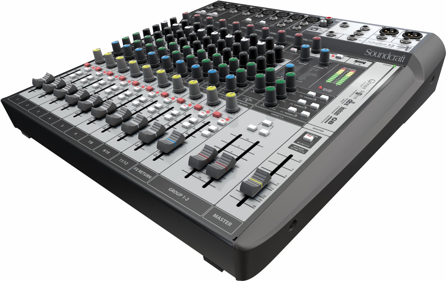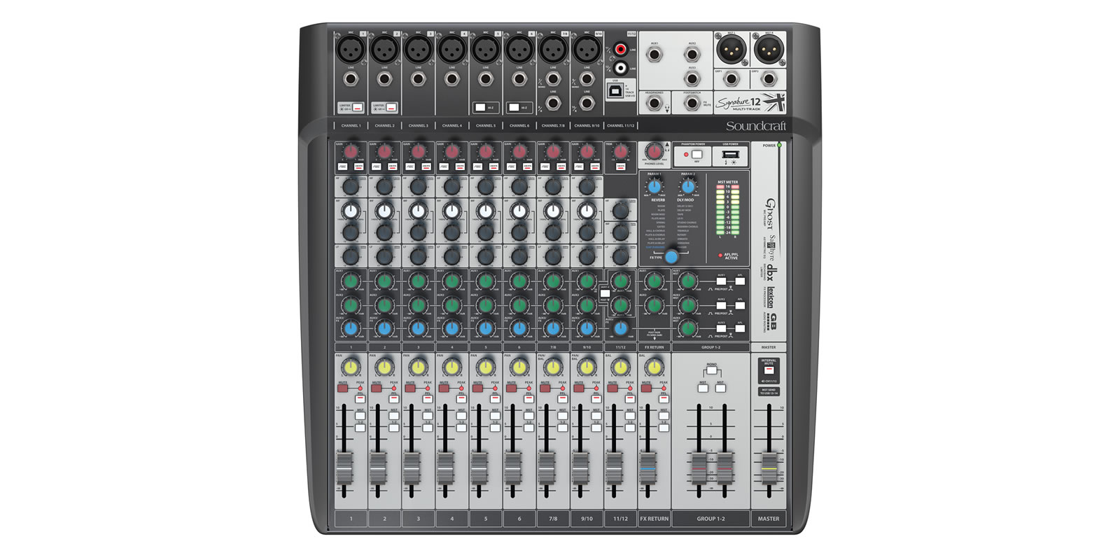 Hi pass φίλτρα και 48V phantom power σε όλα τα μικροφωνικά κανάλια, 3 aux sends για εφέ ή monitor, δύο μονοφωνικά/ 1 στερεοφωνικό subgroup και USB interface με 2in/2out. Επιπλέον διαθέτει 14 ψηφιακά κανάλια εισόδου και 12 ψηφιακά κανάλια εξόδου με σύνδεση USB. Διατίθενται δωρεάν τα Ableton Live 9 Lite και τα plug-in της LEXICON το MPX-L. Μικρού μεγέθους fader 60mm με τεχνολογία audio routing από την σειρά GB.
