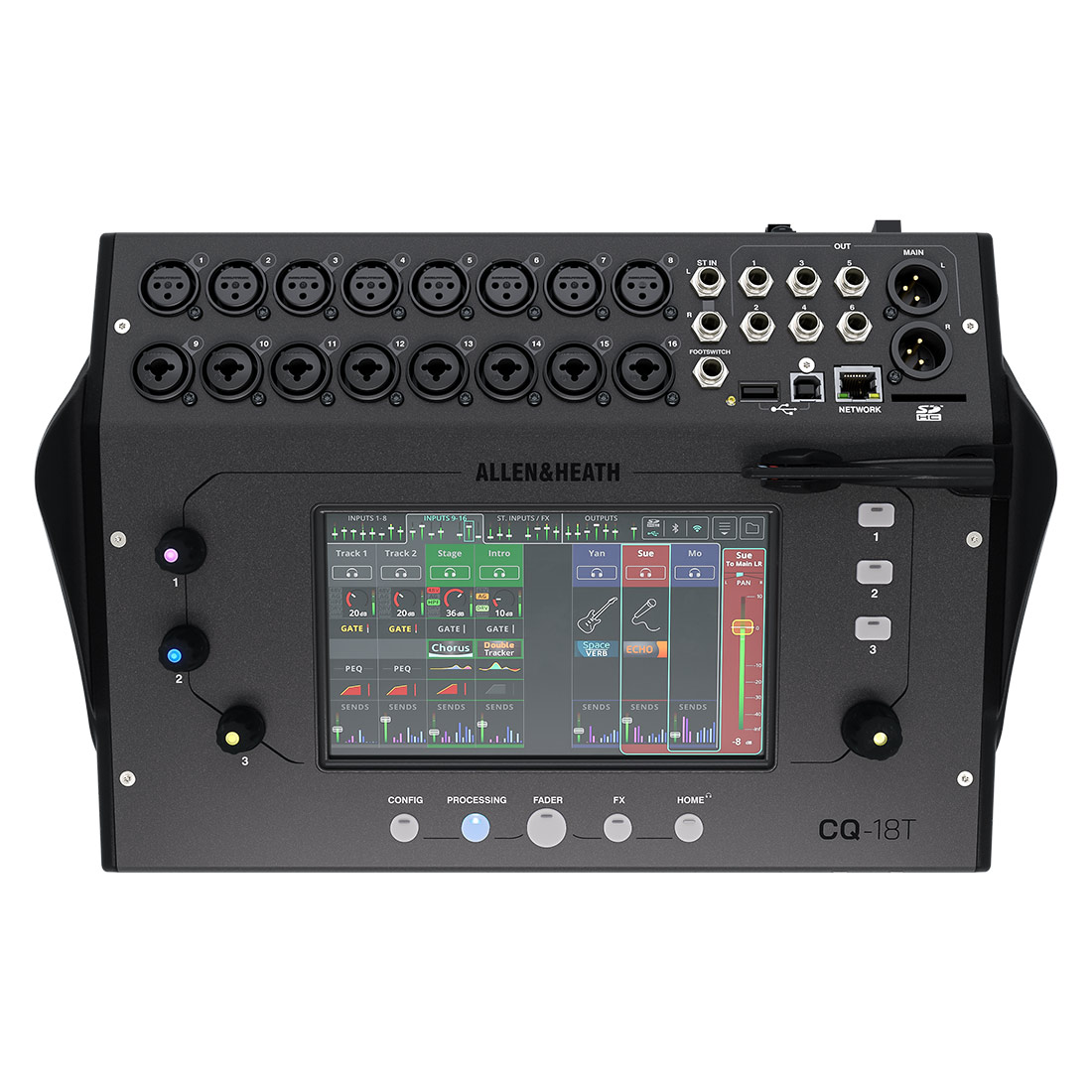 Allen & Heath CQ-18T, ψηφιακή κονσόλα μικρή σε μέγεθος, με οθόνη 7" ιντσών, χαμηλό βάρος και με πληθώρα συνδέσεων και λειτουργιών, σχεδιασμένη για να χρησιμοποιείται παντού και όπου απαιτείται υψηλής ποιότητας επεξεργασία ήχου. Ιδανική για παραγωγούς, μπάντες και σκηνές που θέλουν ευελιξία στον ήχο.