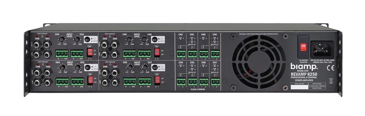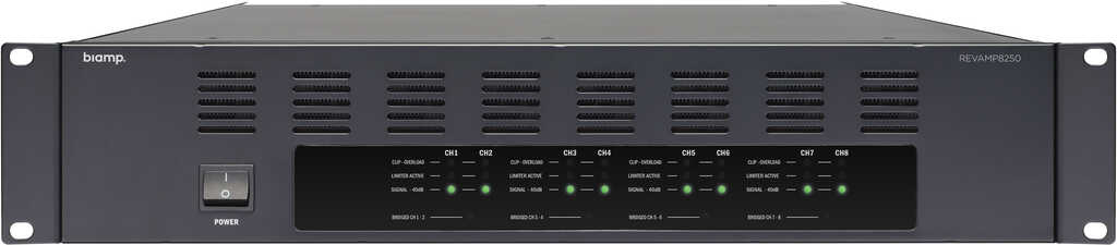 This 8-channel bridgeable power amplifier is all about versatility. Combined with a pre-amplifier or matrix, the REVAMP8250 can be used to create 8 zones in mono, 4 zones in stereo, even 4 bridged mono or 2 bridged stereo systems can be created. The amplifier has an intelligent variable speed cooling fan built-in to keep the unit cool.