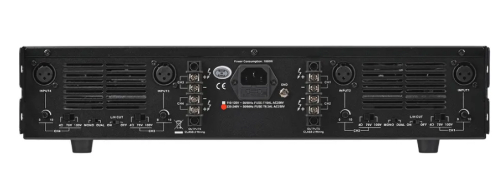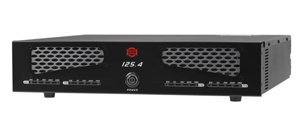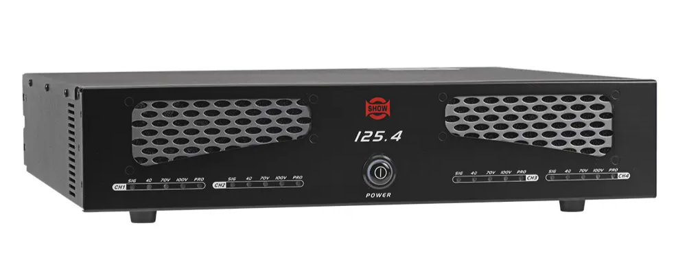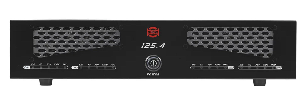 Show 125.4 Επαγγελματικός ψηφιακός τελικός ενισχυτής 4 καναλιών με ισχύ 4 x 125W και λειτουργία στα 100V / 70V / 4Ω. Στην πίσω πλευρά βρίσκονται είσοδοι XLR (Balanced) και έξοδοι screw terminals. Διαστάσεις (MxBxY) 483 x 353 x 88,5mm – 9,2 κιλά