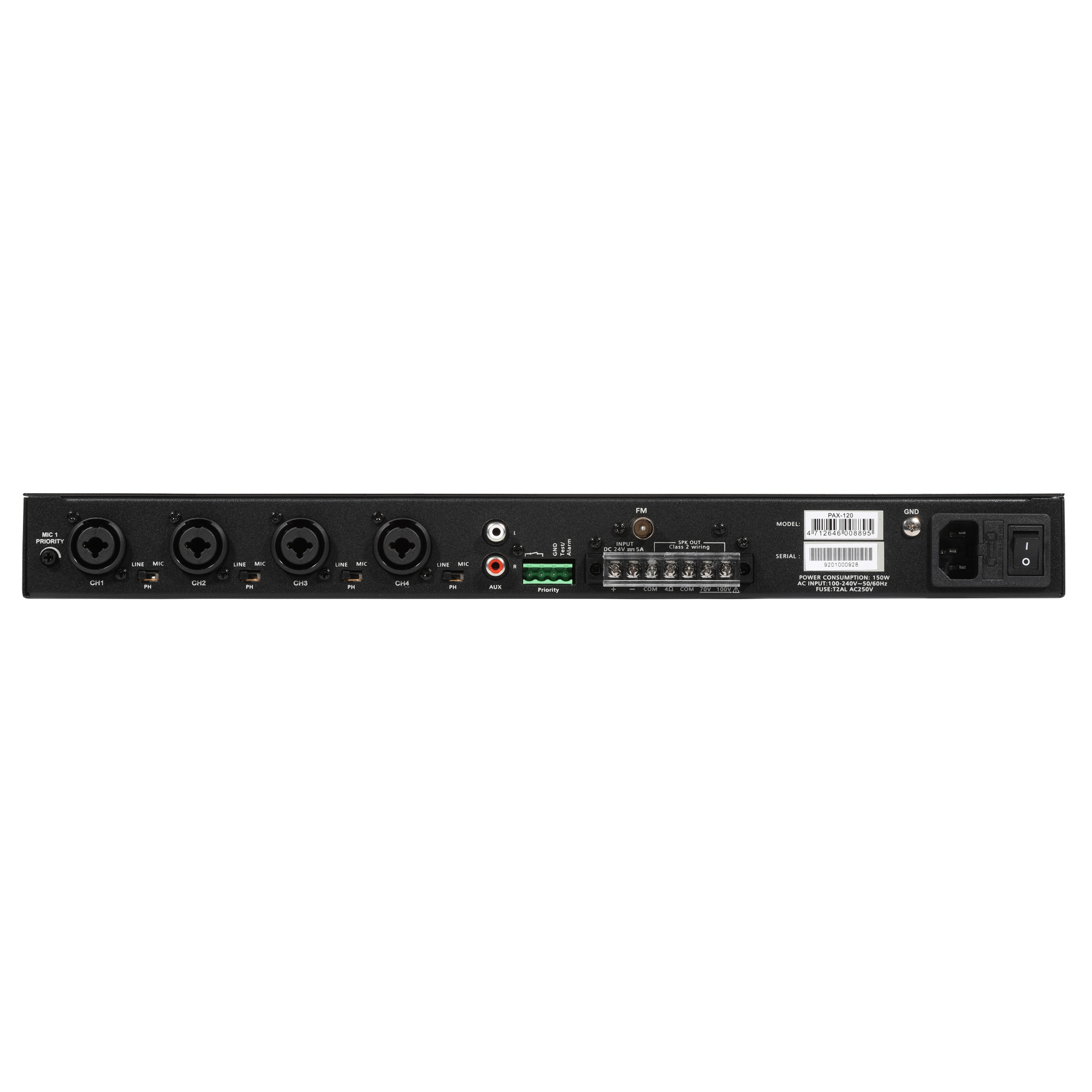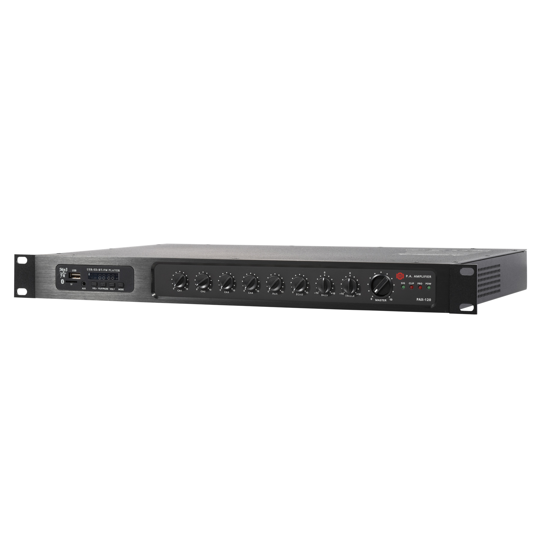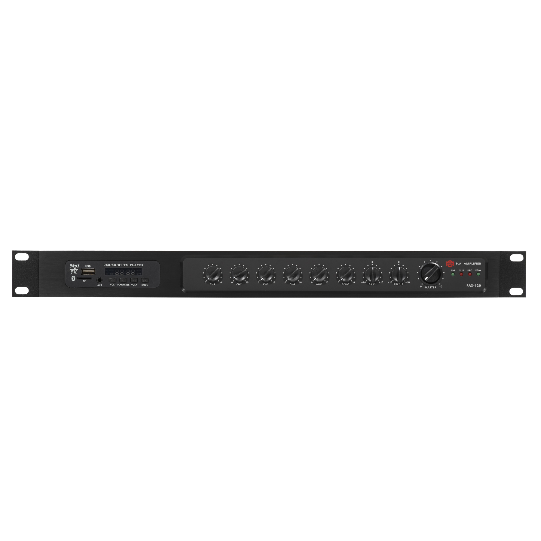 Show PAX-120 ολοκληρωμένος ενισχυτής Class D ισχύος 120W / 100V. Στην μπροστινή όψη βρίσκονται, μία θύρα USB και SD card reader για αναπαραγωγή μουσικών αρχείων. Διαθέτει Bluetooth για ασύρματη σύνδεση με συσκευές ήχου και δέκτη FM. Στην πίσω πλευρά υπάρχουν 4 είσοδοι μικροφώνου (XLR) με επιλογή ανάμεσα σε mic / line με προτεραιότητα στην πρώτη είσοδο για αναγγελίες έκτακτης ανάγκης και μία AUX (RCA). Ο PAX-120 είναι ιδανικός για συστήματα αναγγελιών και background μουσικής σε χώρους όπως εμπορικά καταστήματα, bar, εστιατόρια κ.α. Μέγεθος Rack 1U. Διαστάσεις (MxBxY) 483 x 281 x 44mm – 4,9 κιλά