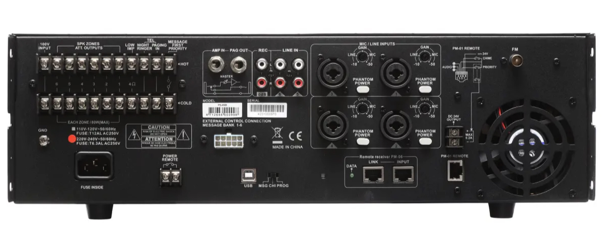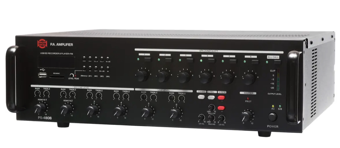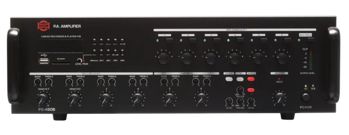 Show PS-4806 ολοκληρωμένος ενισχυτής με μίκτη, 6 ζωνών και ισχύ 80W / 100V ανα ζώνη. Στην μπροστινή όψη βρίσκονται, μία θύρα USB και SD card reader για αναπαραγωγή μουσικών αρχείων και μηνυμάτων αναγγελιών ενώ διαθέτει και δέκτη FM αλλά και δυνατότητα εγγραφής περιεχομένου. Στην πίσω πλευρά υπάρχουν 4 είσοδοι μικροφώνου (Combo XLR / TRS) με gain control, επιλογή phantom, 2 line in (RCA), Rec Out, Pre Out και είσοδο Amp. Κατάλληλο για μεγάλες εμπορικές εγκαταστάσεις και πολυχώρους όπου απαιτείτε αξιόπιστο σύστημα αναγγελιών και background μουσικής σε πολλές ζώνες. Διαστάσεις (MxBxY) 444 x 367 x 130mm – 15,1 κιλά