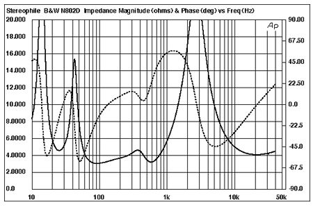 Από την άλλη, η διάστικτη καμπύλη του γραφήματος αναπαριστά τη διακύμανση της ηλεκτρικής φάσης του ηχείου, η οποία φθάνει τις 50 μοίρες στα 1200Hz και τις -50 μοίρες στα 50Hz. Έτσι, αυτό το ηχείο είναι δύσκολο και απαιτητικό φορτίο για έναν ενισχυτή. Είναι σημαντικό να θυμάστε, πως ένα σχετικά εύκολο ηχείο έχει το κροσόβερ του σχεδιασμένο έτσι, ώστε η απόκλιση της ηλεκτρικής φάσης του να μην είναι μεγαλύτερη από ±30 μοίρες.
