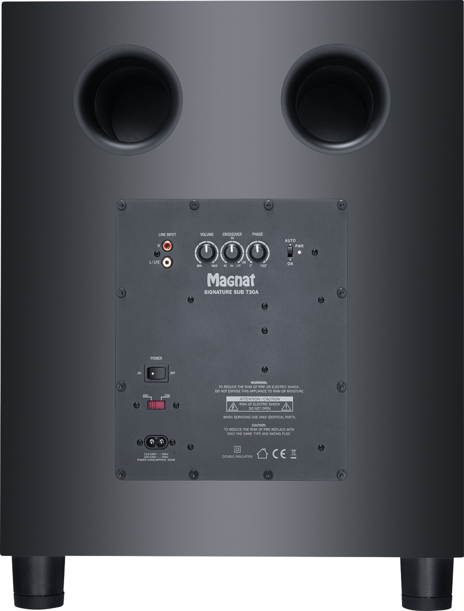 Το ενεργό subwoofer της σειράς Signature 700 είναι πολύ καλό για να κρυφτεί, επειδή διαθέτει επίσης ένα μαύρο ή άσπρο μπροστινό μέρος και σατέν κατασκευή στο ίδιο χρώμα. Ακόμα πιο ενδιαφέρουσα είναι η τεχνολογία στο εσωτερικό, καθώς το γούφερ 300 mm ακτινοβολεί προς τα κάτω σε μια διαμόρφωση "down-firing". Το πλαίσιο μακράς ρίψης έχει βελτιστοποιηθεί χρησιμοποιώντας την τεχνολογία μέτρησης λέιζερ Klippel. Ένας εξαιρετικά αποδοτικός ενισχυτής τάξης D οδηγεί το subwoofer με 190 ή 380 watt συνεχούς/μουσικής ισχύος αντίστοιχα. Το Signature Sub 730 A μπορεί να αναπαράγει ισχυρούς ήχους έως 19 Hz, και η ένταση και η συχνότητα crossover μπορούν να συντονιστούν με ακρίβεια για την ακουστική του δωματίου και τα κύρια ηχεία που χρησιμοποιούνται.