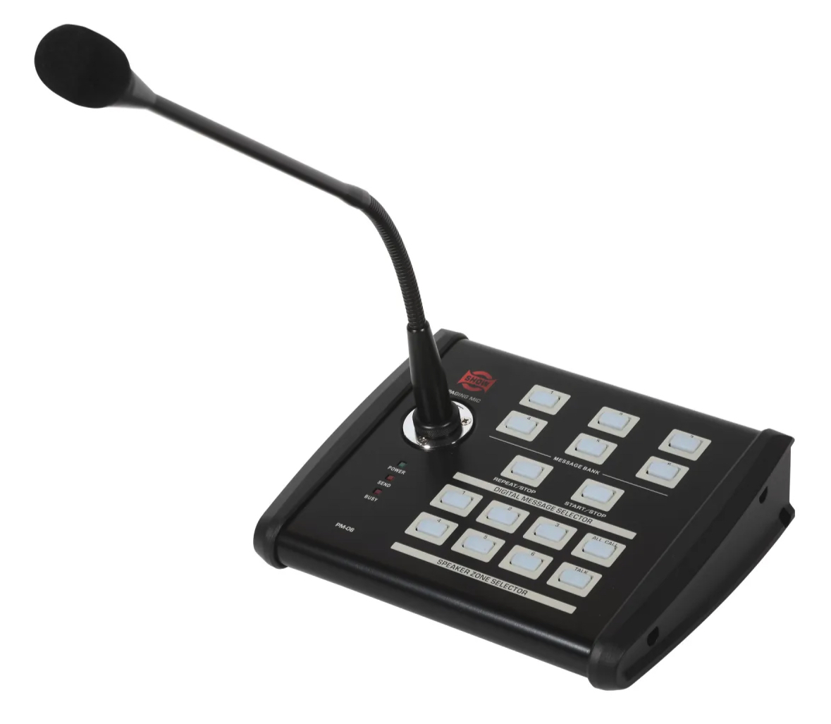 Show PM-06 μικρόφωνο αναγγελιών 6 ζωνών για χρήση με τον ενισχυτή 6 ζωνών Show PS-4806. Διαθέτει είσοδo RCA για σύνδεση εξωτερικής πηγής ήχου και συνδέεται με τον ενισχυτή μέσω καλωδίου Cat5e που επιτρέπει την εγκατάσταση του μικροφώνου σε απόσταση άνω των 100m. To PM-06 έχει ενσωματωμένο Chime και Θύρα usb για σύνδεση με PC μέσω του οποίου μπορει να τροποποιηθεί ο ήχος του Chime. Επίσης έχει δυνατότητα αναπαραγωγής έως και 6 προηχογραφημένων μυνημάτων στον ενισχυτή PS-4806 με controls Play/Stop/Repeat.