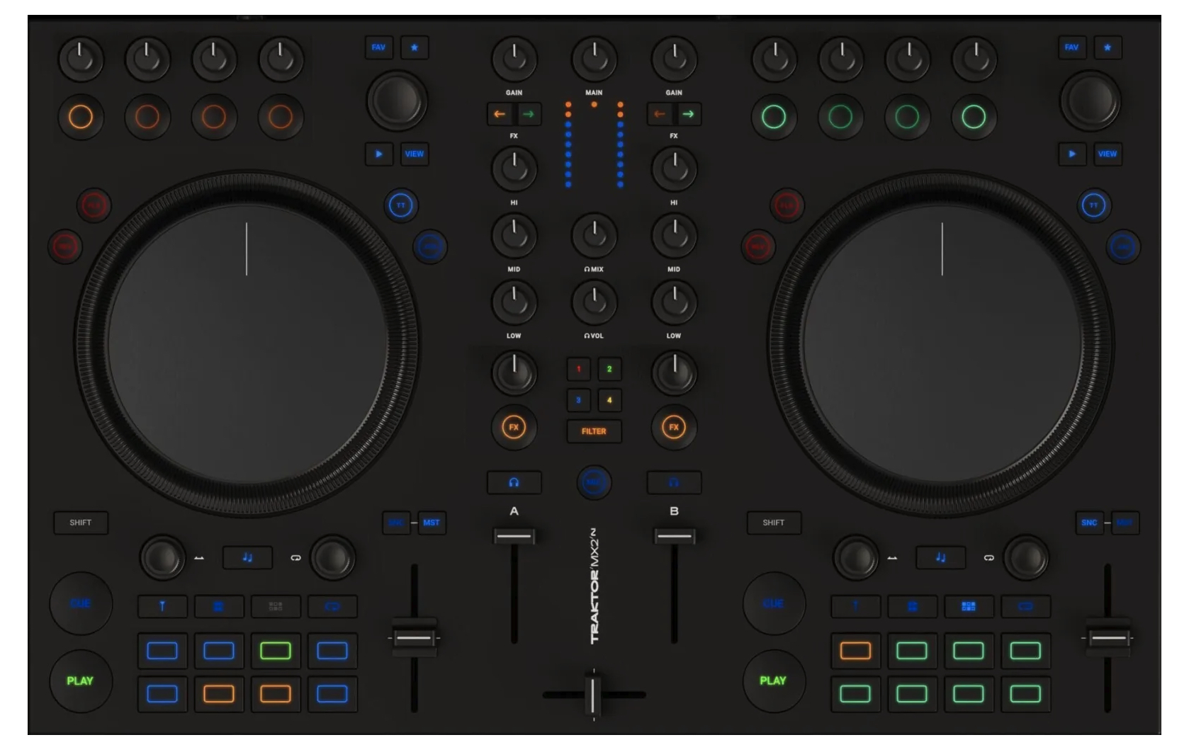 - Two‑deck controller layout with full mixer section, filter knobs, gain control and three‑band EQ.