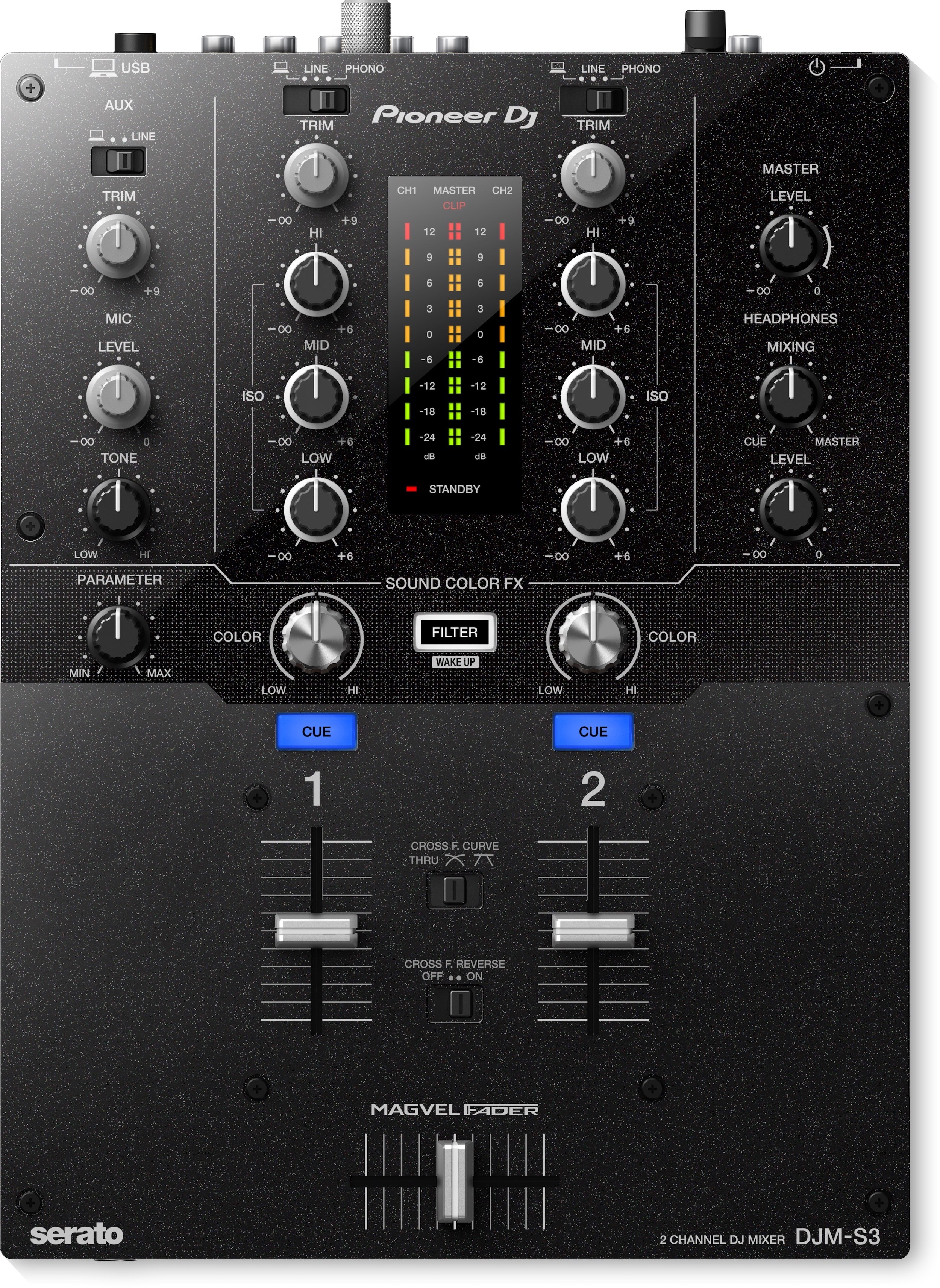 Pioneer DJM-S3 Battle ψηφιακός μίκτης 2 καναλιών πλήρως συμβατός Plug & Play με Serato DJ. Διαθέτει ενσωματωμένη κάρτα ήχου usb, φίλτρα sound color FX, ισοσταθμητή 3 ζωνών /κανάλι, ανεξάρτητα τμήματα μικροφώνου, magvel crossfader.