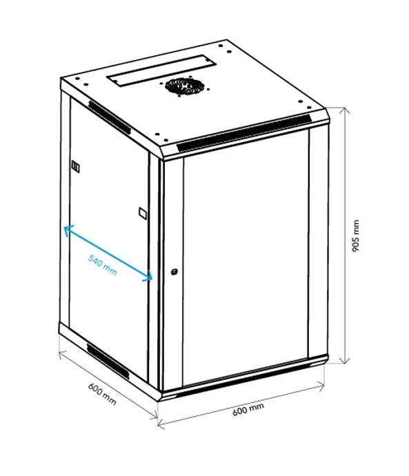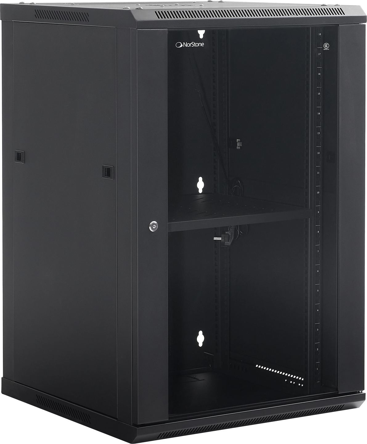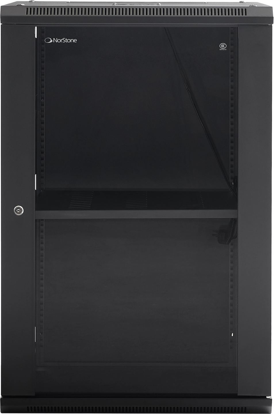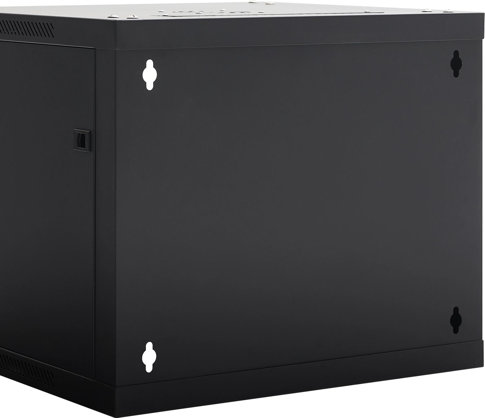 The 18U Wall Rack is a 19-inch wall-mounted cabinet designed for the storage and organization of electronic and IT equipment. With a capacity of 18 units, it offers a practical and robust solution for network and audiovisual installations. Its satin black metal design ensures an elegant integration into any environment. It is equipped with a tempered glass door with a lock, an integrated fan, and removable side panels for easy access to cabling.