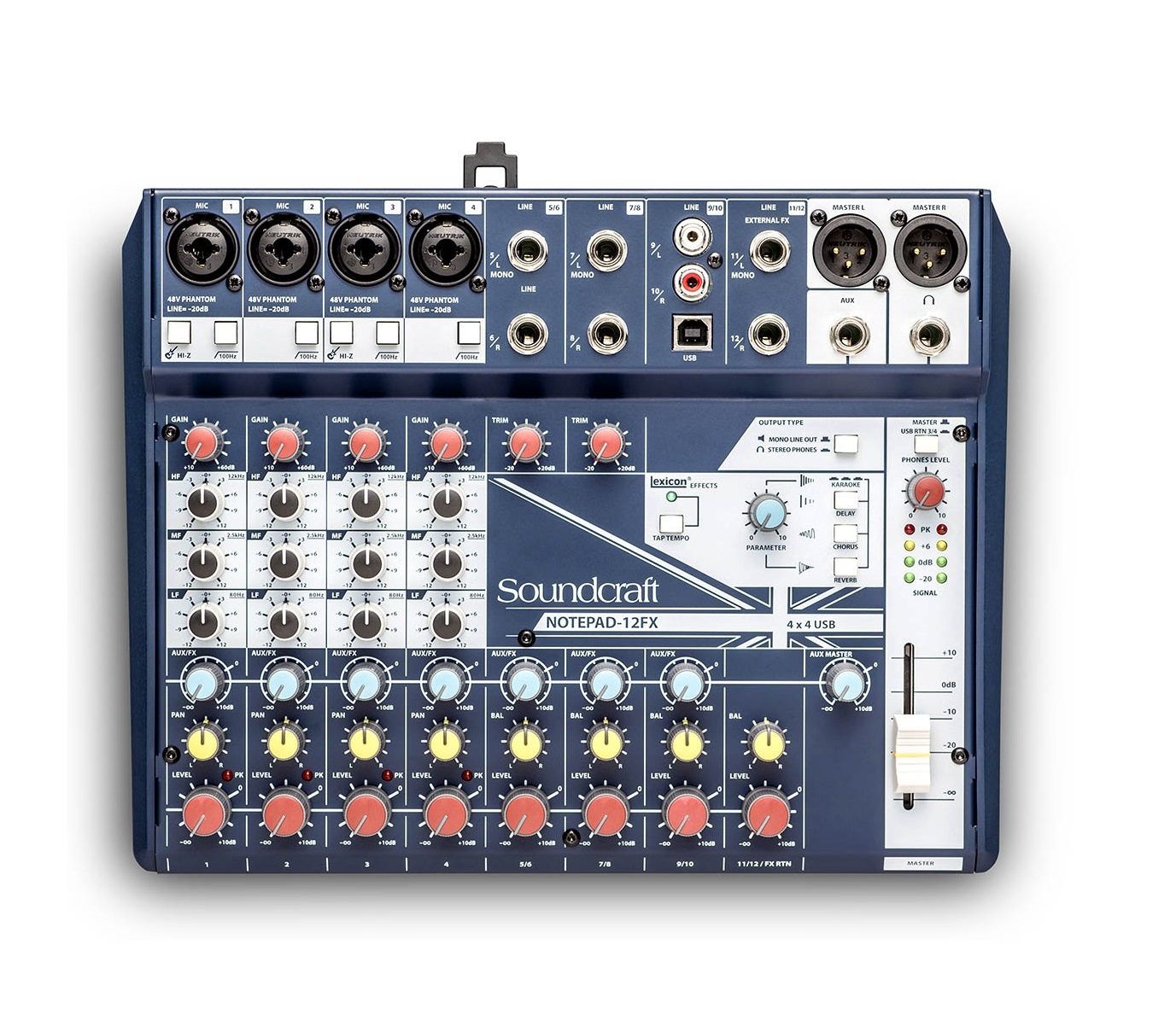 Κονσόλα μίξης 4 mono/line, 4 stereo line, περιστροφικά ποτενσιόμετρα σε κάθε κανάλι, Gain, ΕQ 3 περιοχών, 1AUX/FX send, balanced, High Pass filter σε όλα τα mono inputs καθώς επίσης και 2 επιλεγόμενες εισόδους Hi-Z, 1AUX/FX send, balanced και trim σε κάθε στερεοφωνική είσοδο. Balanced XLR εξόδους, 60mm fader και ένδειξη στάθμης σήματος για το master section. Ξεχωριστή έξοδο για ακουστικά. Με ενσωματωμένο effect LEXICON και AUX οut καθώς επίσης και digital ΙΝ/ΟUT μέσω USB.