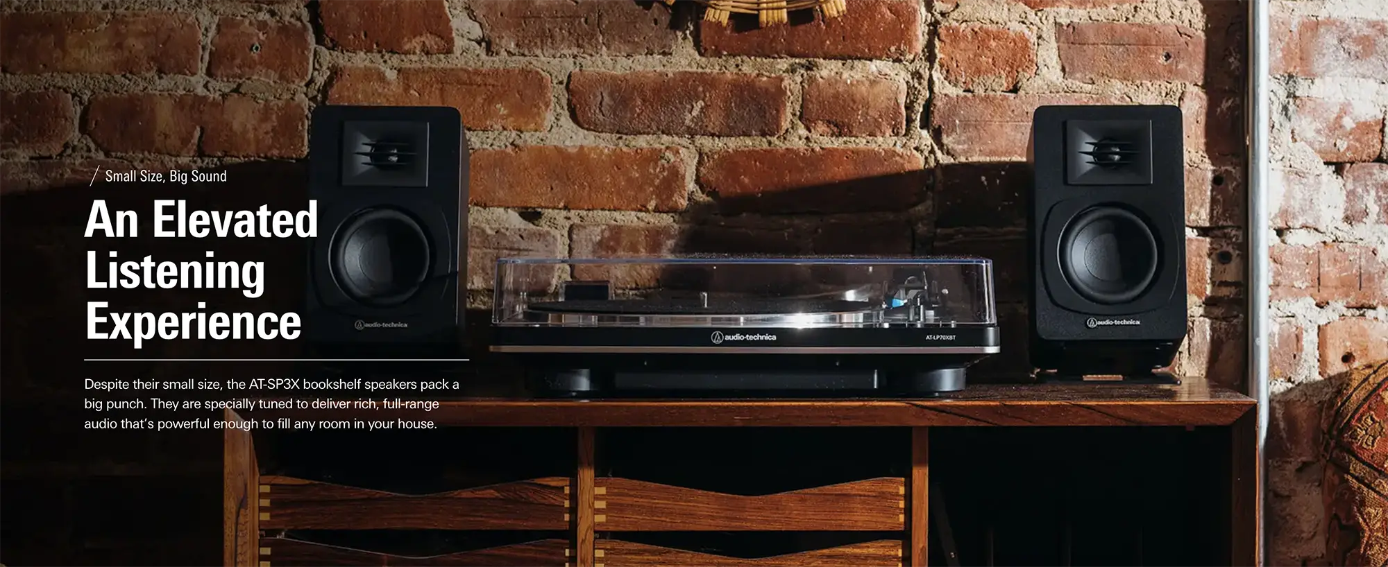 An Elevated Listening Experience. Despite their small size, the AT-SP3X bookshelf speakers pack a big punch. They are specially tuned to deliver rich, full-range audio that’s powerful enough to fill any room in your house.