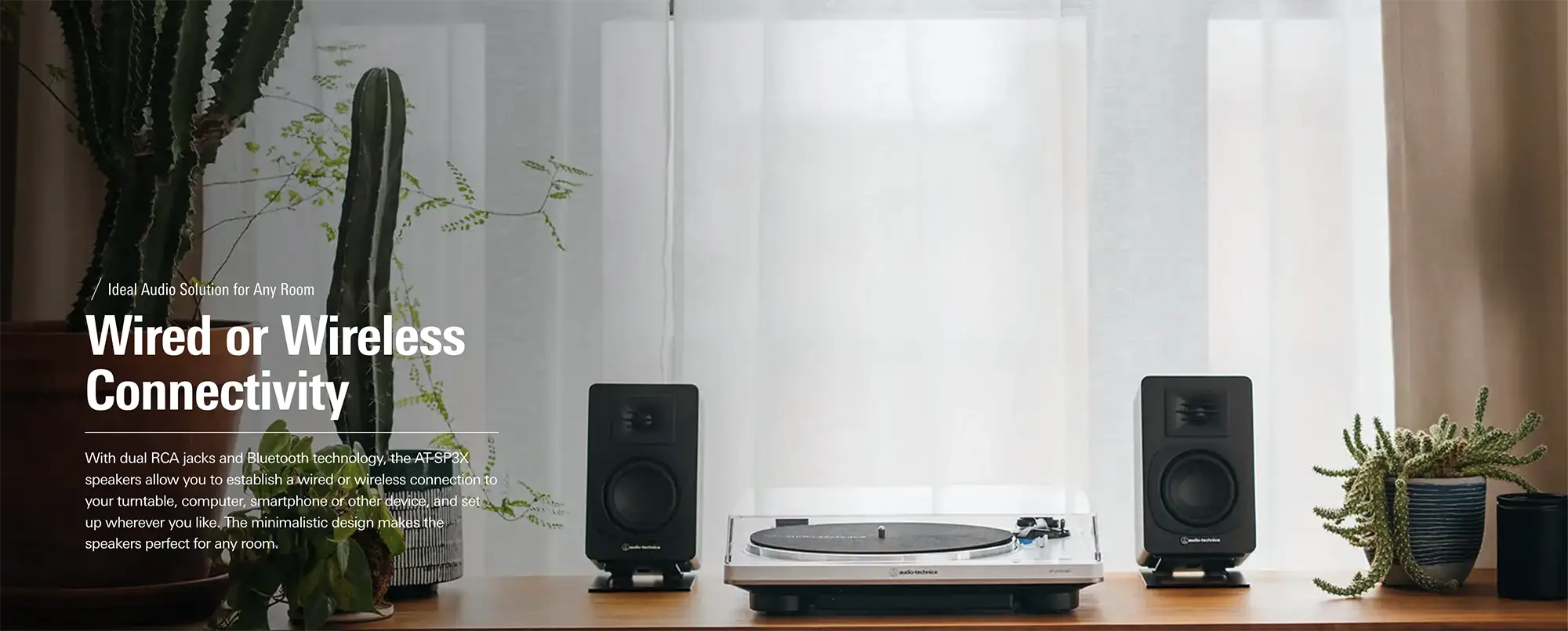 With dual RCA jacks and Bluetooth technology, the AT-SP3X speakers allow you to establish a wired or wireless connection to your turntable, computer, smartphone or other device, and set up wherever you like. The minimalistic design makes the speakers perfect for any room.