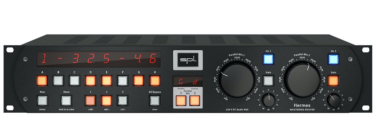 Hermes revolutionizes mastering. Now it is possible to have an audio signal processed by up to eight 2-channel processors in any order that can be stored. At the push of a button you can compare up to four complex processing chains.