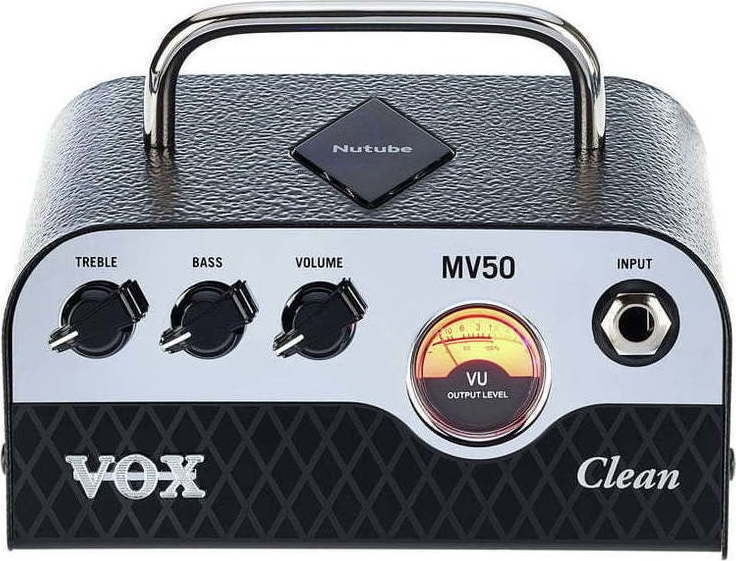 Ενισχυτής ηλεκτρικής κιθάρας mini κεφαλή Vox MV 50 Clean, με αναλογικό προενισχυτή τεχνολογίας Nutube, ισχύος 50 watt, τελικός ενισχυτής class D, ρυθμιστικά gain, EQ και volume, διακόπτης EQ στην πίσω πλευρά, έξοδος line/ακουστικών με cabinet simulator, επιλογέας αντίστασης 4, 8 και 16 Ohms, διακόπτης eco mode, ενδεικτικό VU meter σήματος εξόδου, εμφάνιση retro design, βάρους 540 gr, λειτουργία με τροφοδοτικό 19 Volt.