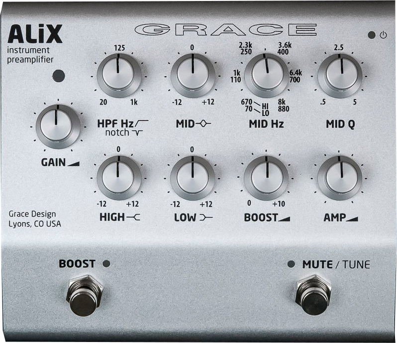 The Grace Design ALiX instrument preamplifier gives you studio-quality sound at your next gig. The powerful EQ controls on the ALiX allow you to sculpt the sound of any stringed instrument to perfection. Other useful features include a dedicated tuner out, a variable and footswitchable boost function, a ground-isolated DI output, and more. If you want an instrument preamp with Grace Design's stunning audio performance and legendary reliability, then you need the Grace Design ALiX instrument preamplifier.