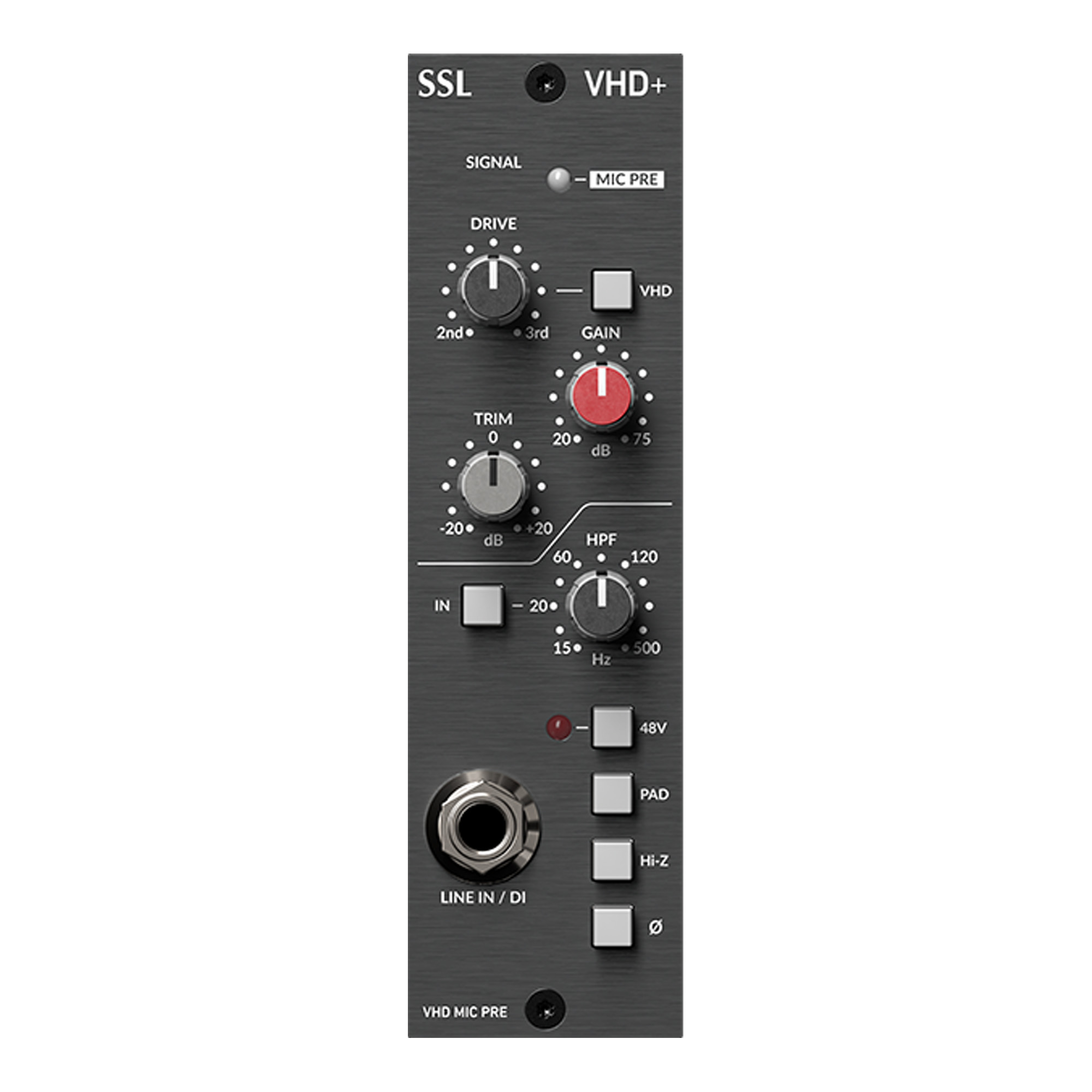 The VHD+ Pre Module for the popular 500 format modular rack platform makes the uniquely versatile VHD based preamp technology from Duality, SSL's industry leading large format studio console, available for studios of all sizes. The VHD+ Pre module is an immensely versatile recording and processing device. It can deliver ultra clean SSL SuperAnalogueTM grade recordings but also features a switchable VHD mode. SSL's patented Variable Harmonic Drive (VHD) system uses a 100% analogue signal path to generate rich harmonic distortion.