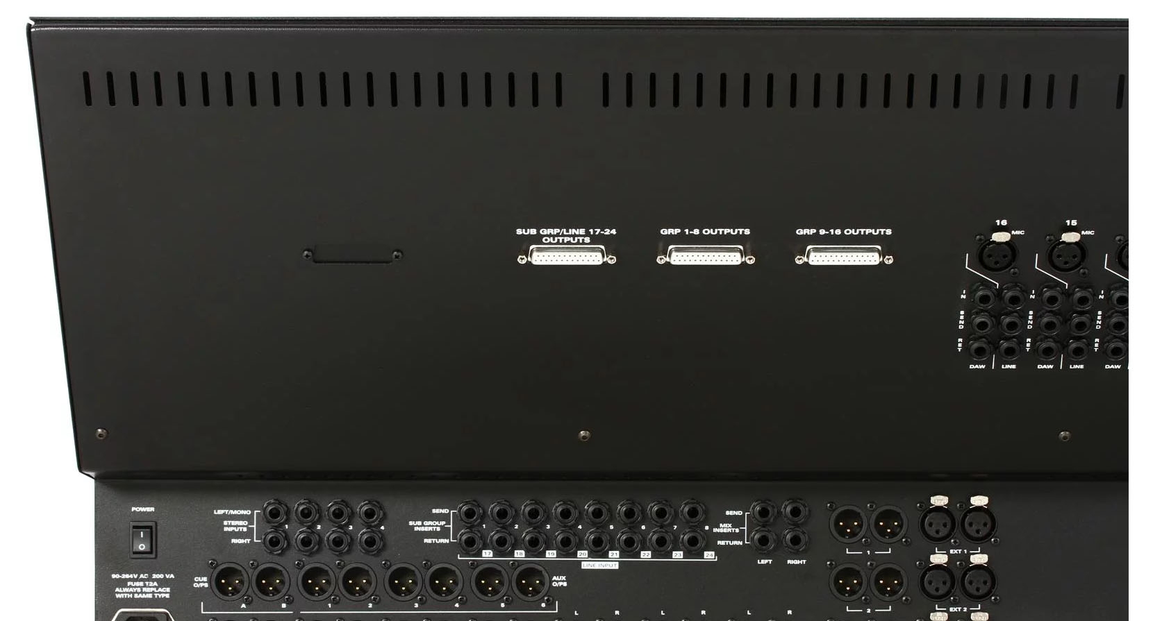 * 16 x main channels each feature dual inputs (each with its own fader), as well as a Class A microphone preamplifier and a 4-band EQ