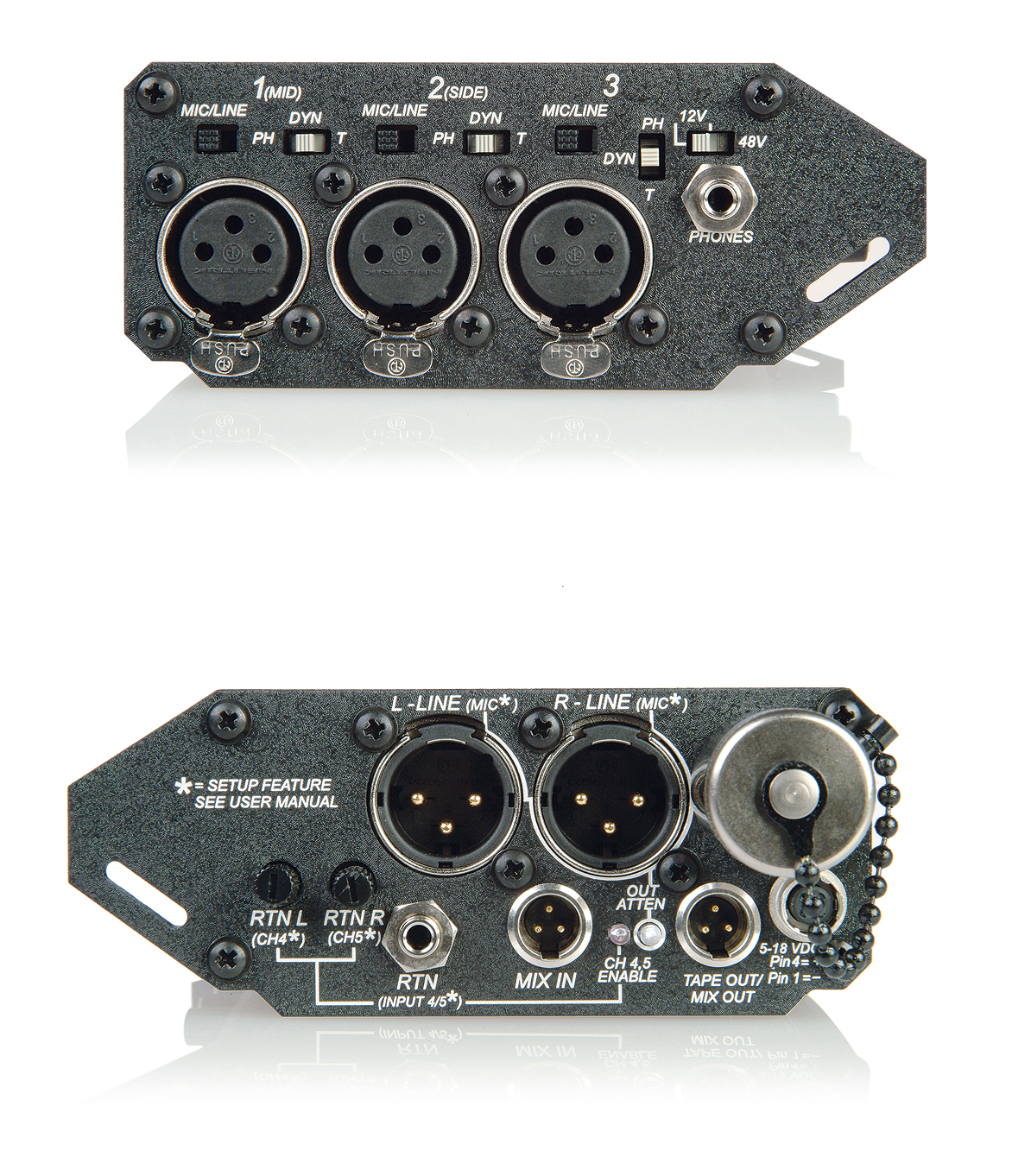 • Phantom (48V or 12V) or “T” microphone powering selected per channel